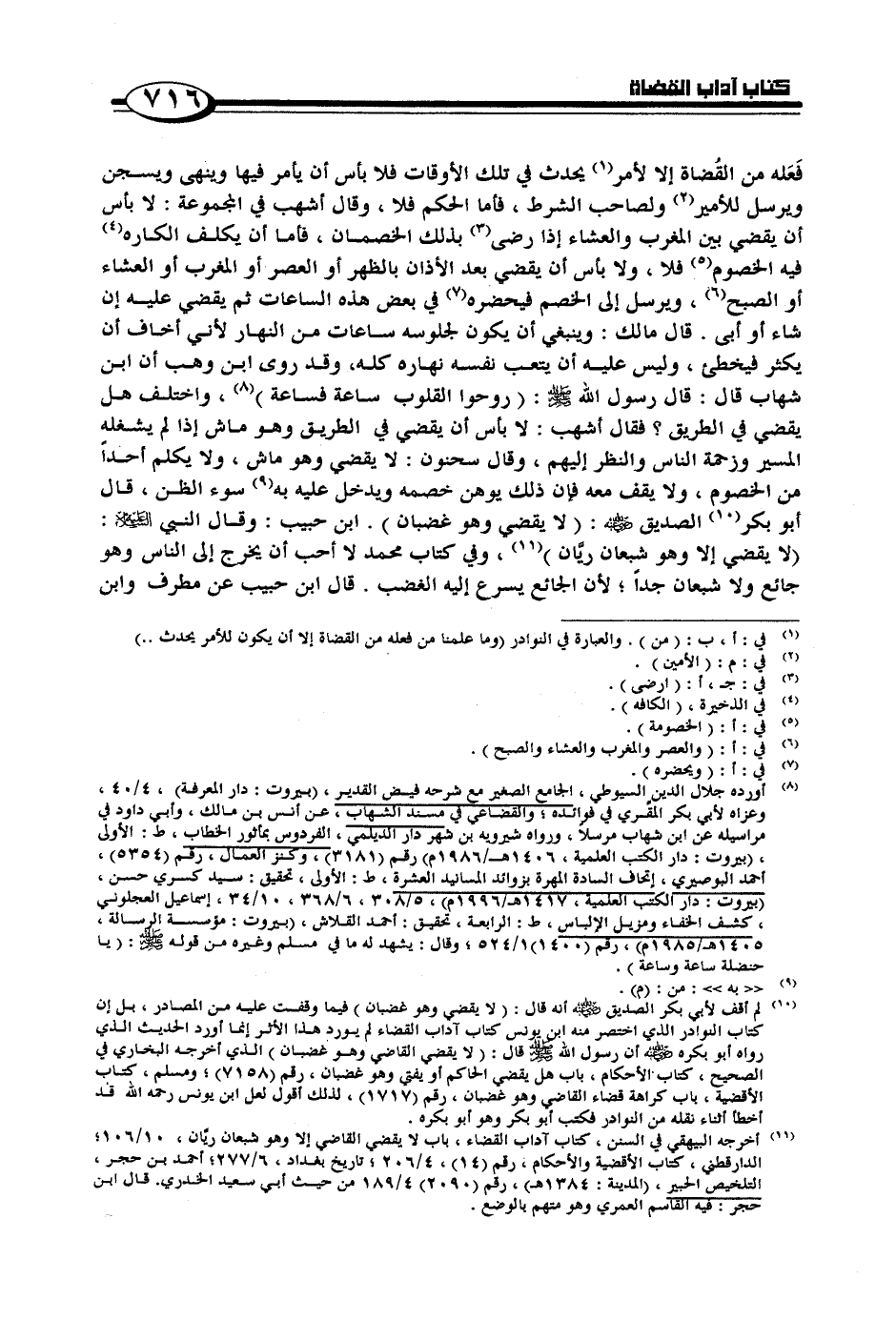 فَعَله من القُضاة إلا لأمر يحدث في تلك الأوقات فلا بأس أن يأمر فيها وينهى ويسجن ويرسل للأمير ولصاحب الشرط، فأما الحكم فلا، وقال أشهب في المجموعة: لا بأس أن يقضي بين المغرب والعشاء إذا رضى بذلك الخصمان، فأما أن يكلف الكاره فيه الخصوم فلا، ولا بأس أن يقضي بعد الأذان بالظهر أو العصر أو المغرب أو العشاء أو الصبح، ويرسل إلى الخصم فيحضره في بعض هذه الساعات ثم يقضي عليه إن شاء أو أبى. قال مالك: وينبغي أن يكون لجلوسه ساعات من النهار لأني أخاف أن يكثر فيخطئ، وليس عليه أن يتعب نفشه نهاره كله، وقد روى ابن وهب أن ابن شهاب قال: قال رسول الله صلى الله عليه وسلم: «روحوا القلوب ساع فساعة»، واختلف هل يقضي في الطريق؟ فقال أشهب: لا بأس أن يقضى في الطريق وهو ماش، ولا يكلم أحداً من الخصوم، ولا يقف معه فإن ذلك يوهن خصمه ويدخل عليه به سوء الظن، قال أبو بكر الصديق رضي الله عنه: (لا يقضي وهو غضبان). ابن حبيب: وقال النبي صلى الله عليه وسلم: «لا يقضي إلا وهو شبعان ريَّان»، وفي كتاب محمد لا أحب أن يخرج إلى الناس وهو جائع ولا شبعان جداً؛ لأن الجائع يسرع إليه الغضب. قال ابن حبيب عن مطرف وابن
