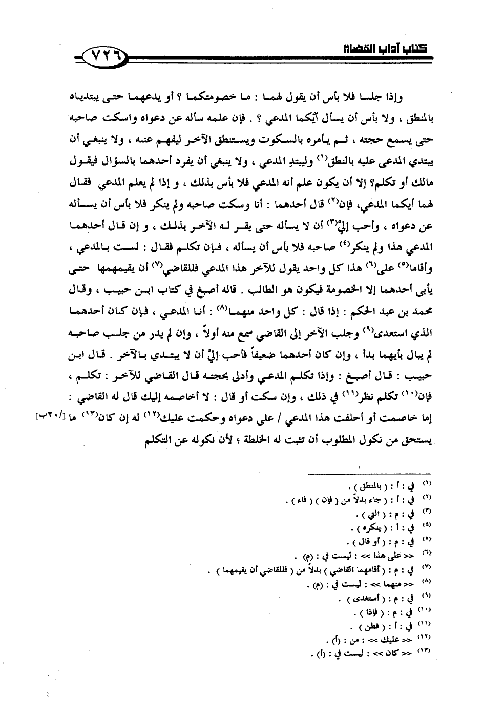 وإذا جلسا فلا بأس أن يقول لهما: ما خصومتكما؟ أو يدعهما حتى يبتدياه بالمنطق، ولا بأس أن يسأل أيكما المدعي؟. فإن علمه سأله عن دعواه واسكت صاحبه حتى يسمع حجته، ثم يأمره بالسكوت ويستنطق الآخر ليفهم عنه، ولا ينبغي أن يبتدي المدعي عليه بالنطق وليبتدِ المدعي، ولا ينبغي أن يفرد أحدهما بالسؤال فيقول مالك أو تكلم؟ إلا أن يكون علم أنه فلا بأس بذلك، وإذا لم يعلم المدعي فقال لهما أيكما المدعي، فإن قال أحدهما: أنا وسكت صاحبه ولم ينكر فلا بأس أن يسأله عن دعواه، وأحب إليَّ أن لا يسأله حتى يقر له الآخر بذلك، وإن قال أحدهما المدعي هذا ولم ينكر صاحبه فلا بأس أن يسأله، فإن تكلم فقال: لست بالمدعي، وأقاما على هذا كل واحد يقول للآخر هذا المدعي فللقاضي أن يقيمهمها حتى يأبى أحدهما إلا الخصومة فيكون هو الطالب. قال أصبغ في كتاب ابن حبيب، وقال محمد بن عبد الحكم: إذا قال: كل واحد منهما: أنا المدعي، فإن كان أحدهما الذي استعدى وجلب الآخر إلى القاضي سمع منه أولاً، وإن لم يدر من جلب صاحبه لم يبال بأيهما بدا، وإن كان أحدهما ضعيفاً فأحب إليَّ أن لا يبتدي بالآخر. قال ابن حبيب: قال أصبغ: وإذا تكلم المدعي وأدلى بحجته قال القاضي للآخر: تكلم، فإن تكلم نظر في ذلك، وإن سكت أو قال: لا أخاصمه إليك قال له القاضي: إما خاصمت أو أحلفت هذا المدعي / على دعواه وحكمت عليك له إن كان ما يستحق من نكول المطلوب أن تثبت له الخلطة؛ لأن نكوله عن التكلم