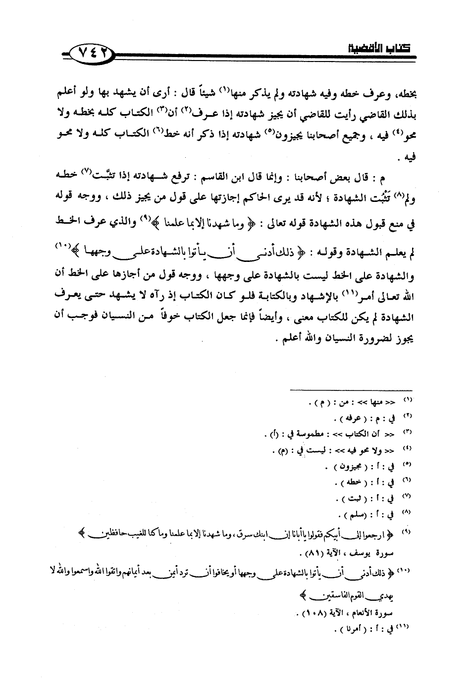 م: قال بعض أصحابنا: وإنما قال ابن القاسم: ترفع شهادته إذا تثبت خطه ولم تثبت الشهادة،؛ لأنه قد يرى الحاكم إجازتها على قول من يجيز ذلك، ووجه قوله في منع قبول هذه الشهادة قوله تعالى: {وَمَا شَهِدْنَا إِلَّا بِمَا عَلِمْنَا} والذي عرف الخط لم يعلم الشهادة وقوله: {ذَلِكَ أَدْنَى أَنْ يَاتُوا بِالشَّهَادَةِ عَلَى وَجْهِهَا} والشهادة على الخط ليست بالشهادة على وجهها، ووجه قول من أجازها على الخط أن الله تعالى أمر بالإشهاد وبالكتابة فلو كان الكتاب إذ رآه لا يشهد حتى يعرف الشهادة لم تكن للكتاب معنى، وأيضاً فإنما جعل الكتاب خوفاً من النسيان فوجب أن يجوز لضرورة النسيان والله أعلم.