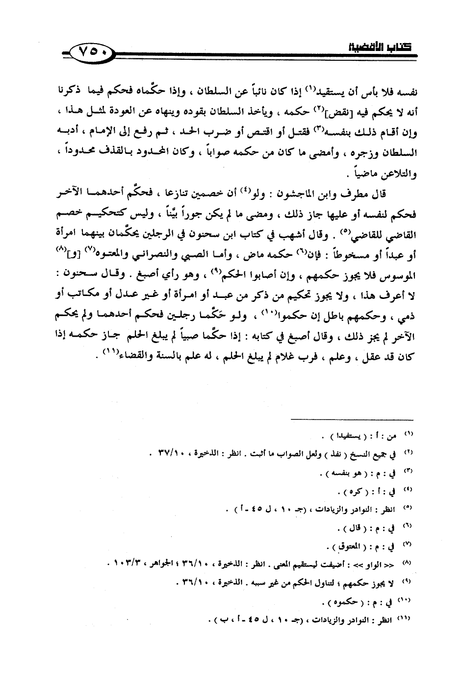 نفسه فلا بأس أن يستقيد إذا كان نائباً عن السلطان، وإذا حكماه فحكم فيما ذكرنا أنه لا يحكم فيه [نقض] حكمه، ويأخذ السلطان بقوده وينهاه عن العودة لمثل هذا، وإن أقام ذلك بنفسه فقتل أو اقتص أو ضرب الحد، ثم رفع إلى الإمام، أدبه السلطان وزجره، وأمضى ما كان من حكمه صواباً، وكان المحدود بالقذف محدوداً، والتلاعن ماضياً.