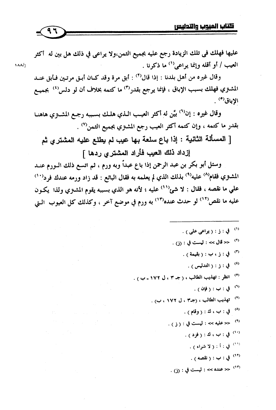 وسئل أبو بكر بن عبد الرحمن إذا باع عبدًا وبه ورم، ثم اتسع ذلك الورم عند المشتري فقام عليه بذلك الذي لم يعلمه به فقال البائع: قد زاد ورمه عندك فرد على ما نقصه، فقال: لا شيء عليه؛ لأنه هو الذي بسببه يقوم المشتري ولذا يكون عليه ما نقص لو حدث عنده به ورم في موضع آخر، وكذلك كل العيوب التي