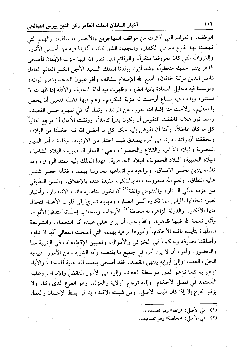 الوطف ، والعزايم التي أذكرت من مواقف المهاجرين والأنصار ما سلف ، والهمم التي نهضنا بها لفتح معاقل الكفار ، والجهاد الذي كانت أثارنا فيه من أحسن الآثار ، والغزوات التي كان معروفها منكرا ، والوقائع التي نصر الله فيها حزب الإيمان فأضحى الدهر ينشر حديثه متعطرا ، وشدأزرنا بولدنا الملك السعيد الأجل الكبير العالم العادل ناصر الدين بركه خاقان ، امتع الله الإسلام ببقائه ، وأفرعيون المجد بنصر لوائه ، وتوسمنا فيه مخايل السعادة بادية الغرر ، وظهرت فيه أدلة النجابة ، والأدلة إذا ظهرت لاتستتر ، وبدت فيه مساع أوجبت له مزبة التكريم ، وعم فيها فضله فتغين أن يخص بالتعظيم ، ولاحت منه إشارات يعرب عن الرشد ، وتدل أنه في تدبيره حسن القصد ، وسما نور هلاله فاتفقت النفوس أن يكون بدرا كاملا ، ووثقت الآمال أن يرجع حاليا كل ما كان عاطلا ، رأينا أن نفوض إليه حكم كل ما أمضى الله فيه حكمنا من البلاد ، وتحققنا أن رائد نظرنا في أمره يصدق فيما اختار من الارتياد . وقلدناه أمر الديار المصرية والبلاد الشامية والقلاع والحصون ، وهي : الديار المصرية ، البلاد الشامية ، البلاد الحلبية ، البلاد الحموية ، البلاد الحمصية . فهذا الملك إليه ممتد الرواق ، ودو نظامه يتزين بحس الإنساق ، ونواحيه مع اتساع محروسة بهممه ، فكأنه خصر اشتمل عليه النطاق ، ونعم الله محروسة معه بالشكر ، مقيده عنده بالإطلاق ، والدين الحنيفي من عزمه عالي المنار ، والنفوس واثقة أن تكون بناصره دائمة الانتصار ، وأخبار نصره تحفظها الليالي مما تكرره ألسن العمار ، ومهابته تسري إلى قلوب الأعداء فتحول منها الأفكار ، والدولة الزاهرة به محاطة الأرجاء ، وسحائب إحسانه متدفق الأنواء ، وآثار نعمة الله فيها ظاهرة ، والله يحب أن يرى على عبده أثر النعماء . والشريعة المطهرة بتأييده نافذة الأحكام ، وأمورها مرعية بهممه التي أضحت المعالي أنها لا تنام . وأطلقنا تصرفه وحكمه في الخزائن والأموال ، وتعيين الإقطاعات في الغيبه منا والحضور . وأمرنا أن لايرد أمره في جميع ما يقتضيه رأيه الشريف من الأمور . فبيديه الحل والعقد ، وإلى أبوابه ينتهي القصد . فقد أضحى بحمد الله حلية للمجد ، والأيام تزهو به كما تزهو الدرر بواسطة العقد ، وإليه في الأمور النقض والإبرام . وعليه المعتمد في فصل الأحكام . وإليه ترجع الولاية والعزل ، وهو الفرع الذي زكا ، ولا يزكو الفرع إلا إذا كان طيب الأصل . ومن شيمته الإقتداء بنا في بسط الإحسان والعدل