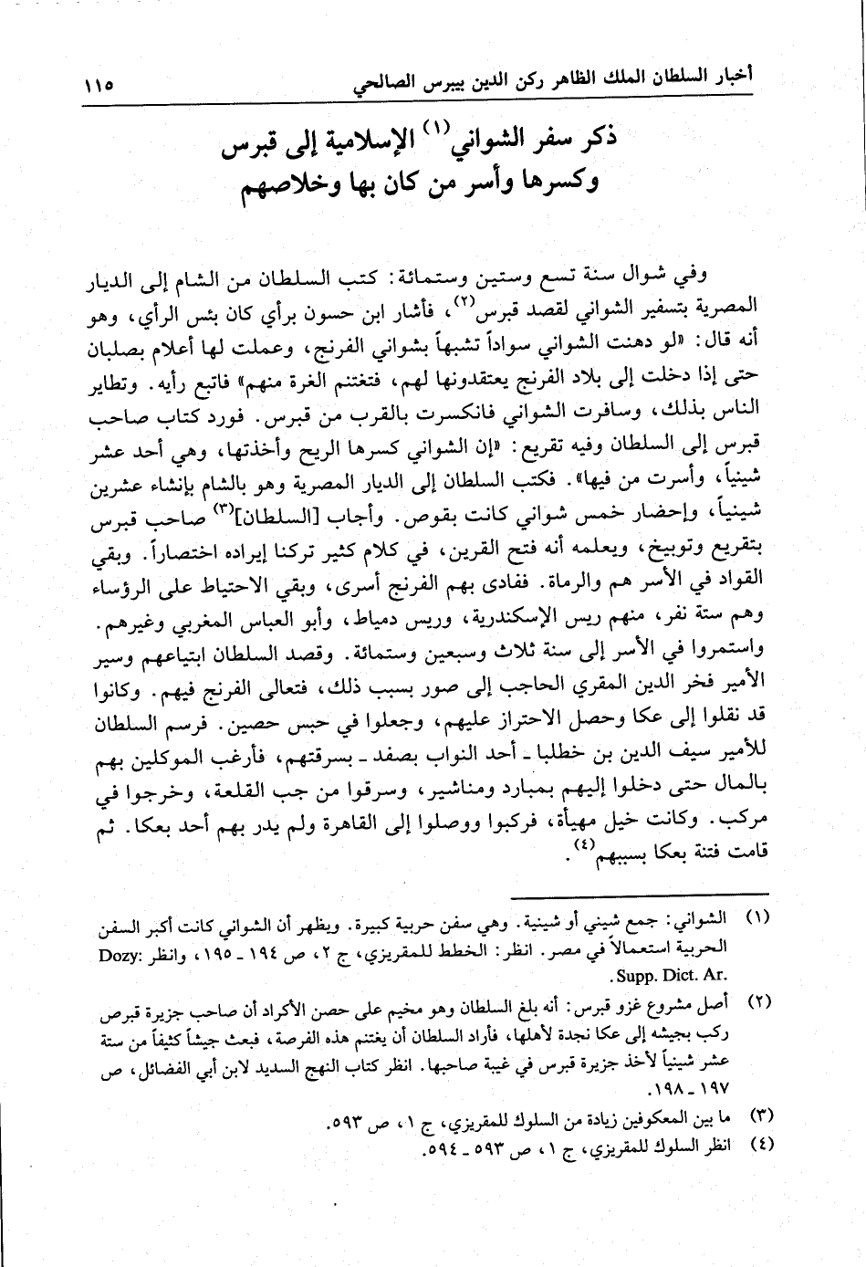 وفي شوال سنة تسع وستين وستمائة : كتب السلطان من الشام إلى الديار المصرية بتسفير الشواني لقصد قبرس ، فأشار ابن حسون برأي كان بئس الرأي ، وهو أنه قال : " لو دهنت الشواني سواد تشبها بشواني الفرنج ، وعملت لها أعلام بصلبان حتى إذا دخلت إلى بلاد الفرنج يعتقدونها لهم ، فتغتنم الغرة منهم " فاتبع رأيه . وتتطاير الناس بذلك ، وسافرت الشواني فانكسرت بالقرب من قبرس فورد كتاب صاحب قبرس إلى السلطان وفيه تقريع : " إن الشواني كسرها الريح وأخذتها ، وهي أحد عشر شينيا ، وأسرت من فيها " . فكتب السلطان إلى الديار المصرية وهو بالشام بإنشاء عشرين شينيا وإحضار خمسة شواني كانت بقوص . وأجاب " السلطان " صاحب قبرس بتقريع وتوبيخ ، ويعلمه أنه فتح القرين في كلام كثير تركنا إيراده اختصارا . وبقي القواد في الأسر هم والرماة . ففادي بهم الفرنج أسرى ، وبقي الاحتياط على الرؤساء وهم ستة نفر ، منهم ريس الإسكندرية ، وريس دمياط ، وأبو العباس المغربي وغيرهم . واستمروا في الأسر إلى سنة ثلاث وسبعين وستمائة . وقصد السلطان ابتياعه وسير الأمير فخر الدين المقري الحاجب إلى صور بسبب ذلك ، فتغالى الفرنج فيهم . وكانوا قد نقلوا إلى عكا وحصل الاحتزام عليهم ، وجعلوا في حبس حصين . فرسم السلطان للأمير سيف الدين بن خطلبا - أحد النواب بصفد - بسرقتهم ، فأرغب الموكلين بهم بالمال حتى دخلوا إليهم بمبارد ومناشير ، وسرقوا من جب القلعة ، وخرجوا في مركب . وكانت خيل مهيأة ، فركبوا ووصلوا إلى القاهرة ولم يدر بهم أحد بعكا . ثم قامت فتنة بعكا بسببهم .