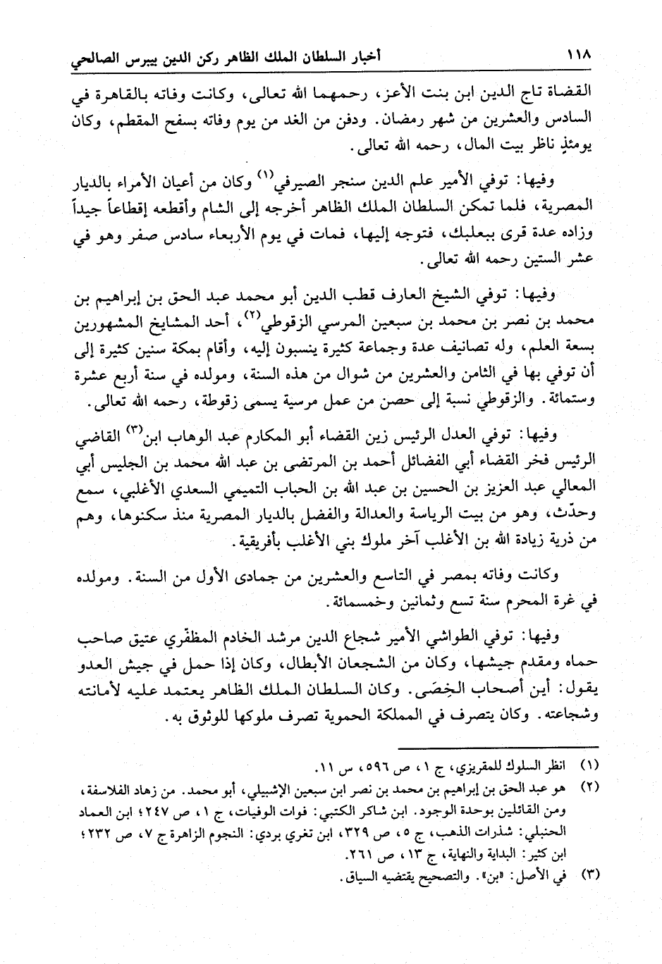 وفيها : توفي الأمير علم الدين سنجر الصيرفي وكان من أعيان الأمراء بالديار المصرية ، فلما تمكن السلطان الملك الظاهر أخرجه إلى الشام وأقطعه إقطاعا جيدا وزاده عدة قرى ببعلبك ، فتوجه إليها فمات في يوم الأربعاء سادس صفر وهو في عشر الستين رحمه الله تعالى . وفيها : توفي الشيخ العارف قطب الدين أبو محمد عبد الحق بن إبراهيم بن محمد بن نصر بن محمد بن سبعين المرسي الزقوطي ، أحد المشايخ المشهورين بسعة العلم ، وله تصانيف عدة وجماعة كثيرة ينسبون إليه ، وأقام بمكة سنين كثيرة إلى أن توفي بها في الثامن والعشرين من شوال من هذه السنة ، ومولده في سنة أربع عشر وستمائة . والوقوطي نسبة إلى حصن من عمل مرسية يسمى زقزطة رحمه الله تعالى .