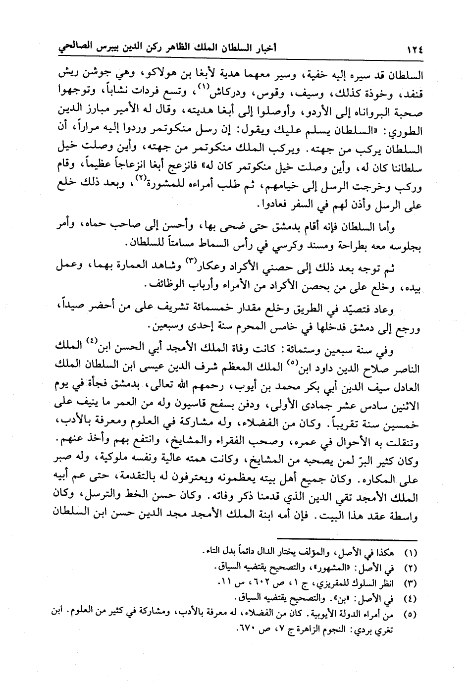 وعاد فتصيد في الطريق وخلع مقدار خمسمائة تشريف على من أحضر صيدا ، ورجع إلى دمشق ودخلها في خامس المحرم سنة إحدى وسبعين . وفي سنة سبعين وستمائة : كانت وفاة الملك الأمجد أبي الحسن بن الملك الناصر صلاح الدين داود بن الملك المعظم شرف الدين عيسى بن السلطان الملك العادل سيف الدين أبي بكر محمد بن أيوب ، رحمهم الله تعالى ، بدمشق فجأة في يوم الاثنين سادس عشر جمادى الأولى ، ودفن بسفح قاسيون وله من العمر ما ينيف على خمسين سنة تقريبا . وكان من الفضلاء ، وله مشاركة في العلوم ومعرفة بالأدب ، وتنقلت به الأحوال في عمره ، وصحب الفقراء والمشايخ ، وانتفع بهم وأخذ عنهم . وكان كثير البز لمن يصحبه من المشايخ . وكانت همته عالية ونفسه ملوكية ، وله صبر على المكاره . وكان جميع أهل بيته يعظمونه ويعترفون له بالتقدمة ، حتى عم أبيه الملك الأمجد تقي الدين الذي قدمنا ذكر وفاته . وكان حسن الخط والترسل ، وكان واسطة عقد هذا البيت . فإن أمه ابنة الملك الأمجد مجد الدين حسن بن السلطان