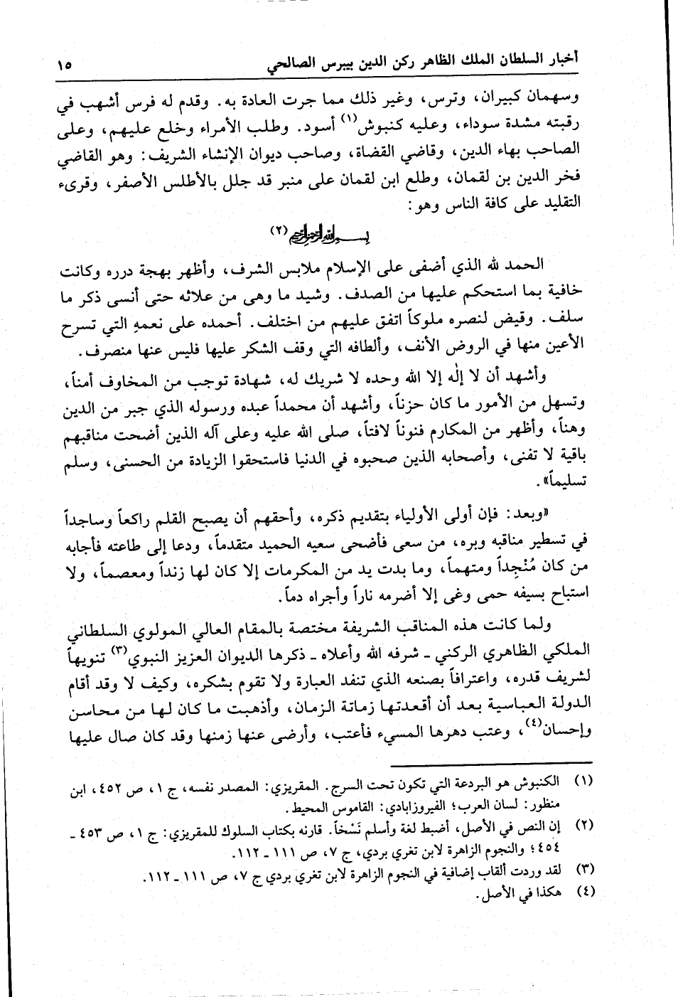 ولما كانت هذه المناقب الشريفة مختصة بالمقام العالي المولوي السلطاني الملكي الظاهري الركني - شرفه الله وأعلاه - ذكرها الديوان العزيز النبوي تنويها الشريف قدره ، واعترافا بصنعه الذي تنفد العباره ولا تقوم بشكره ، وكيف لا وقد أقام الدولة العباسية بعد أن أفعدتها زماتة الزمان ، وأذهبت ما كان لها من محاسن وإحسان ، وعتب دهرها المسئ فأعتب ، وأرضى عنها زمنها وقد كان صال عليها