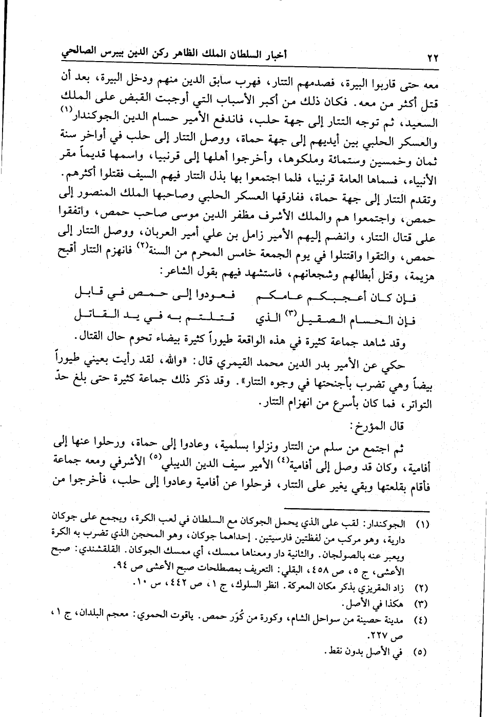 معه حتى قاربوا البيرة ، فصدمهم التتار ، فهرب سابق الدين منهم ودخل البيرة ، بعد أن قتل أكثر من معه . فكان ذلك من أكبر الأسباب التي أوجبت القبض على الملك السعيد ثم توجه التتار إلى جهة حلب ، فاندفع الأمير حسام الدين الجوكندار والعسكر الحلبي بين أيديهم إلى جهة حماه ، ووصل التتار إلى حلب في أواخر سنة ثمان وخمسين وستمائة وملكوها ، وأخرجوا أهلها إلى قرنبيا ، واسمها قديما مقر الأنبياء ، فسماها العامة قرنبيا ، فلما اجتمعوا بها بذل التتار فيهم السيف فقتلوا أكثرهم وتقدم التتار إلى جهة حماة ، ففارقها العسكر الحلبي وصاحبها الملك المنصور إلى حمص ، واجتمعوا هم والملك الأشرف مظفر الدين موسى صاحب حمص ، واتفقوا على قتال التتار ، وانضم إليهم الأمير زامل بن أمير العربان ، ووصل التتار إلى حمص ، والتقوا واقتتلوا في يوم الجمعة خامس المحرم من السنة فانهزم التتار أقيح هزيمة ، وقتل أبطالهم وشجعانهم ، فاستشهدوا فيهم بقول الشاعر :