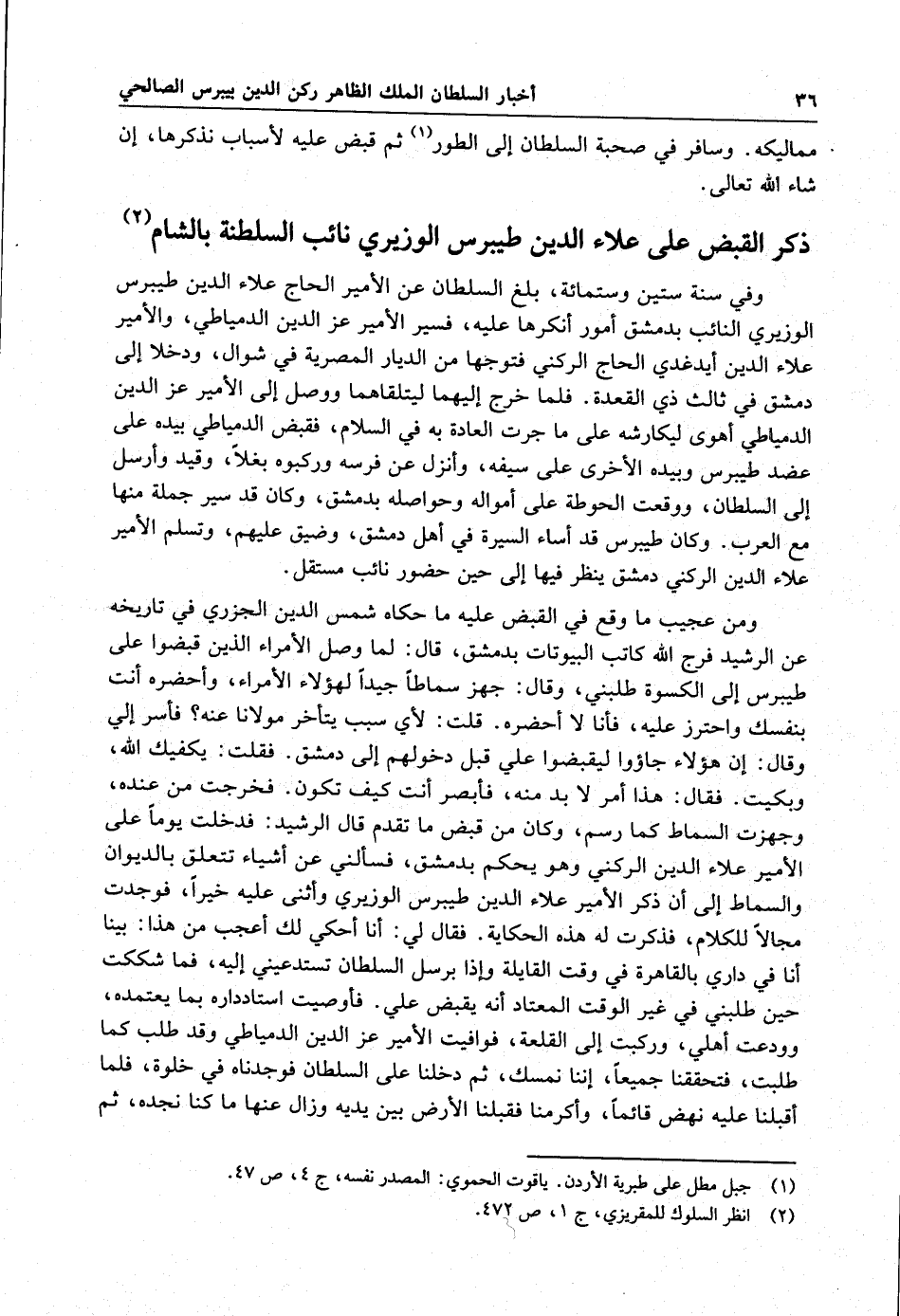 وأثنى عليه خيرا ، فوجدت مجالا للكلام ، فذكرت له هذه الحكاية . فقال لي : أنا أحكي لك أعجب من هذا : بينا أنا في داري بالقاهرة في وقت القايلة وإذا برسل السلطان تستدعيني إليه ، فما شككت حين طلبني في غير الوقت المعتاد أنه يقبض علي . فأوصيت استاداري بما يعتمده ، وودعت أهلي ، وركبت إلى القلعة ، فوافيت الأمير عز الدين الدمياطي وقد طلب كما طلبت ، فتحققنا جميعا إننا نمسك ، ثم دخلنا على السلطان فوجدناه في خلوة ، فلما أقبلنا عليه نهض قائماً ، و أكرمنا فقبلنا الأرض بين يديه وزال عنها ما كنا نجده ، ثم
