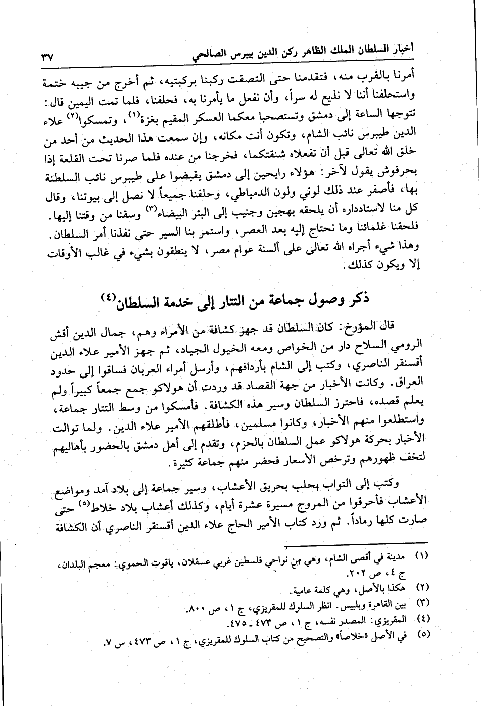 قال المؤرخ : كان السلطان قد جهز كشافة من الأمراء وهم ، جمال الدين أقش الرومي السلاح دار من الخواص ومعه الخيول الجياد ، ثم جهز الأمير علاء الدين أفسنقر الناصري ، وكتب إلى الشام بأردافهم ، وأرسل أمراء العربان فساقوا إلى حدود العراق . وكانت الأخبار من جهة القصاد قد وردت أن هولاكو جمع جمعا كبيرا ولم يعلم قصده ، فاحترز السلطان وسير هذه الكشافة . فأمسكوا من وسط التتار جماعة ، واستطلعوا منهم الأخبار ، وكانوا مسلمين ، فأطلقهم الأمير علاء الدين . ولما توالت الأخبار بحركة هولاكو عمل السلطان بالحزم ، وتقدم إلى أهل دمشق بالحضور بأهاليهم لتخف ظهورهم وترخص الأسعار فحضر منهم جماعة كثيرة .