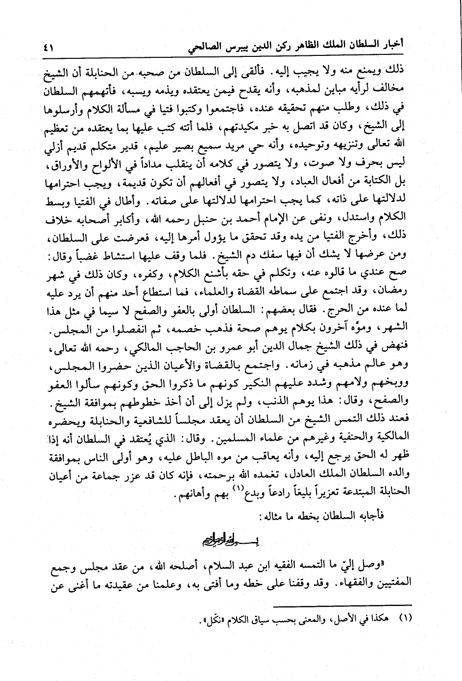 ذلك ويمنع منه ولا يجيب إليه . فألقى إلى السلطان من صحبه من الحنابلة أن الشيخ مخالف لرأيه مباين لمذهبه ، وأنه يقدح فيمن يعتقده ويذمه ويسبه ، فاتهمهم السلطان في ذلك ، وطلب منهم تحقيقه عنده ، فاجتمعوا وكتبوا فتيا في مسألة الكلام وأرسلوها إلى الشيخ ، وكان قد اتصل به خبر مكيدتهم ، فلما أتته كتب عليها بما يعتقده من تعظيم الله تعالى وتنزيهه وتوحيده ، وأنه حي مريد سميع بصير عليم ، قدير متكلم قديم أزلي ليس بحرف ولا صوت ولا يتصور في كلامه أن ينقلب مدادا في الألواح والأوراق ، بل الكتابة من أفعال العباد ، ولا يتصور في أفعالهم أن تكون قديمة ، ويجب احترامها لدلالتها على ذاته ، كما يجب احترامها لدلالتها على صفاته . وأطال في الفتيا وبسط الكلام واستدل ، ونفى عن الإمام أحمد بن حنبل رحمه الله ، وأكابر أصحابه خلاف ذلك ، وأخرج الفتيا من يده وقد تحقق ما يؤول أمرها إليه ، فعرضت على السلطان ، ومن عرضها لا يشك أن فيها سفك دم الشيخ . فلما وقف عليها استشاط غضبا وقال : صح عندي ما قالوه عنه ، وتكلم في حقه بأشنع الكلام ، وكفره ، وكان ذلك في شهر رمضان ، وقد اجتمع على سماطه القضاة والعلماء ، فما استطاع أحد منهم أن يرد عليه لما عنده من الحرج . فقال بعضهم : السلطان أولى بالعفو والصفح لا سيما في مثل هذا الشهر ، وموه آخرون بكلام يوهم صحة فذهب خصمه ، ثم انفصلوا من المجلس . فنهض في ذلك الشيخ جمال الدين أبو عمرو بن الحاجب المالكي ، رحمه الله تعالى ، وهو عالم مذهبه في زمانه . واجتمع بالقضاة والأعيان الذين حضروا المجلس ، ووبخهم ولامهم وشدد عليهم النكير كونهم ما ذكروا الحق وكونهم سألوا العفو والصفح ، وقال : هذا يوهم الذنب ، ولم يزل إلى أن أخذ خطوطهم بموافقة الشيخ . فعند ذلك التمس الشيخ من السلطان أن يعقد مجلسا للشافعية والحنابلة ويحضره المالكية والحنفية وغيرهم من علماء المسلمين . وقال : الذي يعتقد في السلطان أنه إذا ظهر له الحق يرجع إليه ، وأنه يعاقب من موه الباطل عليه ، وهو أولى الناس بموافقة والده السلطان الملك العادل ، تغمده الله برحمته ، فأنه كان قد عزر جماعة من أعيان الحنابلة المبتدعة تعزيرا بليغا رادعا وبدع بهم وأهانهم . فأجابه السلطان بخطه ما مثاله : بسم الله الرحمن الرحيم " وصل إلي ما التمسه الفقيه ابن عبد السلام ، أصلحه الله ، من عقد مجلس وجمع المفتيين والفقهاء . وقد وقفنا على خطه وما أفتى به ، وعلمنا من عقيدته ما أغنى عن