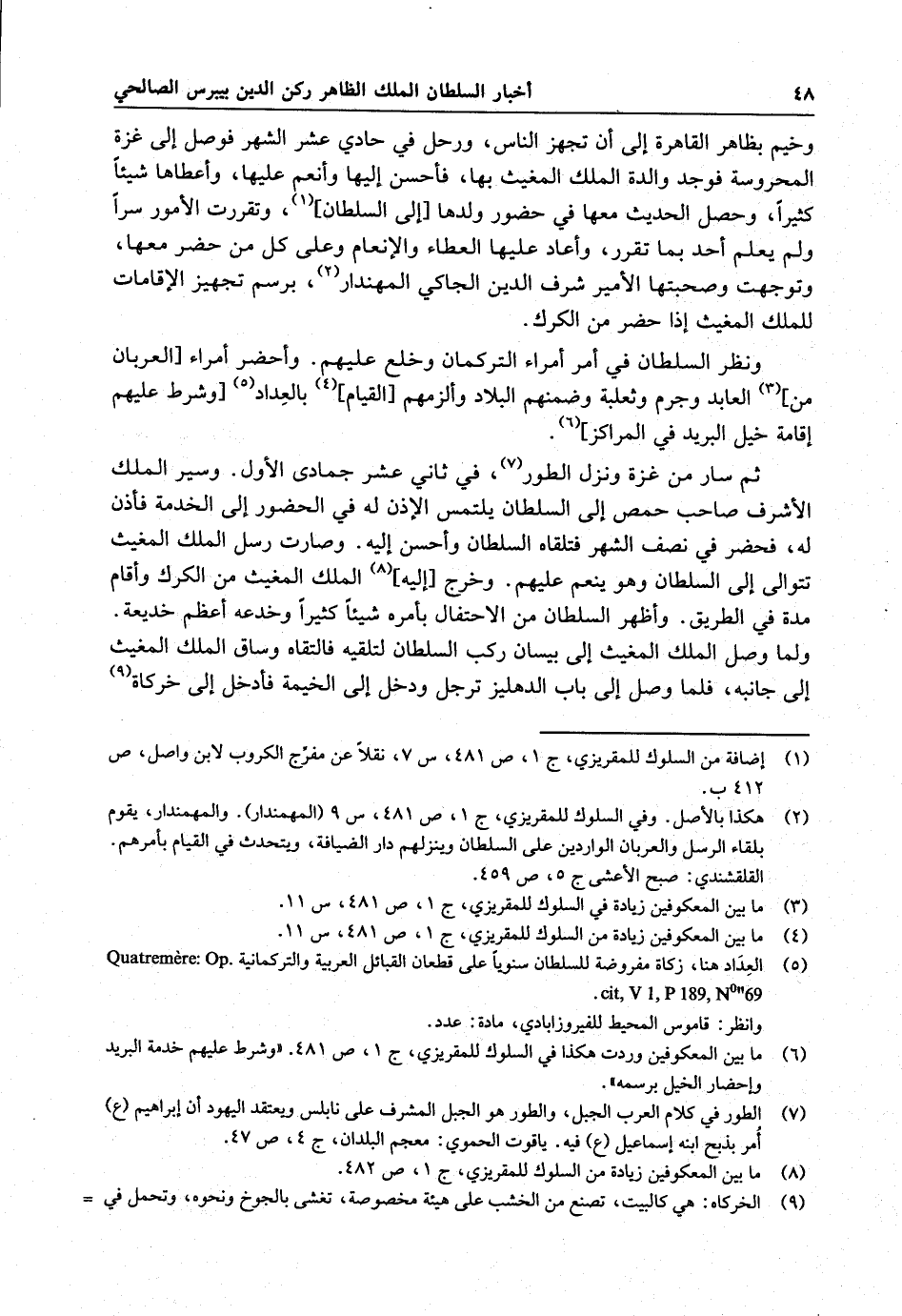 وخيم بظاهر القاهرة إلى أن تجهز الناس ، ورحل في حادي عشر الشهر فوصل إلى غزة المحروسة فوجد والدة الملك المغيث بها ، فأحسن إليها وأنعم عليها ، وأعطاها شيئا كثيرا ، وحصل الحديث معها في حضور ولدها " إلى السلطان " ، وتقررت الأمور سرا ولم يعلم أحد بما تقرر ، وأعاد عليها العطاء والإنعام وعلى كل من حضر معها ، وتوجهت صحبتها الأمير شرف الدين الجاكي المهندار ، برسم تجهيز الإقامات للملك المغيث إذا حضر من الكرك .