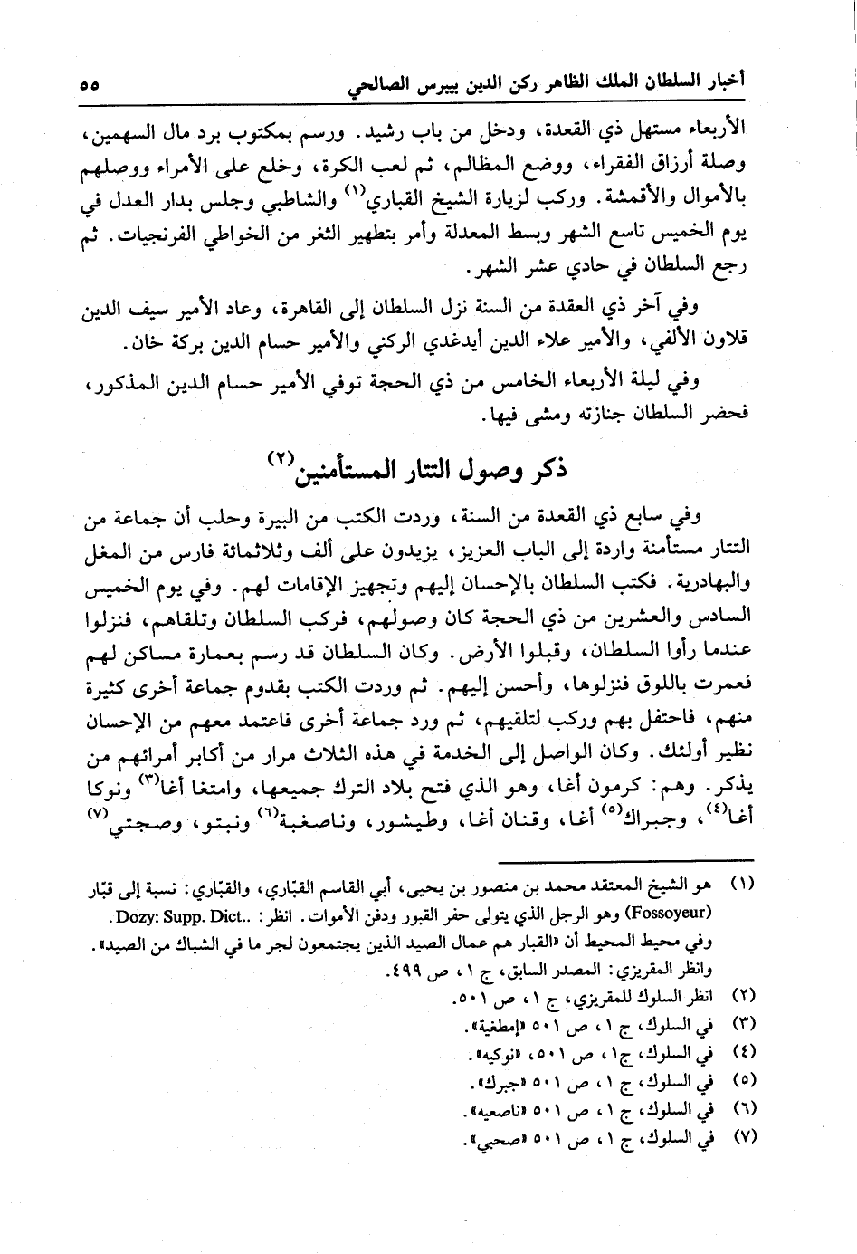 وفي سابع ذي القعدة من السنة ، وردت الكتب من البيرة وحلب أن جماعة من التتار مستأمنة واردة إلى الباب العزيز ، يزيدون على ألف وثلاثمائة فارس من المغل والبهادرية . فكتب السلطان بالإحسان إليهم وتجهيز الإقامات لهم . وفي يوم الخميس السادس والعشرين من ذي الحجة كان وصولهم ، فركب السلطان وتلقاهم ، فنزلوا عندما رأوا السلطان ، وقبلوا الأرض . وكان السلطان قد رسم بعمارة مساكن لهم فعمرت باللوق فنزلوها ، وأحسن إليهم . ثم وردت الكتب بقدوم جماعة أخرى كثبرة منهم . فاحتفل بهم وركب لتلقيهم ثم ورد جماعة أخرى فاعتمد معهم من الإحسان نظير أولئك . وكان الواصل إلى الخدمة في هذه الثلاث مرار من أكابر أمرائهم من يذكر . وهم : كرمون أغا ، وهو الذي فتح بلاد الترك جميعها ، وامتغا أغا ونوكا أغا ، وجبراك أغا ، وقنان أغا ، وطيشور ، وناصغبة ونبتو ، وصجتي