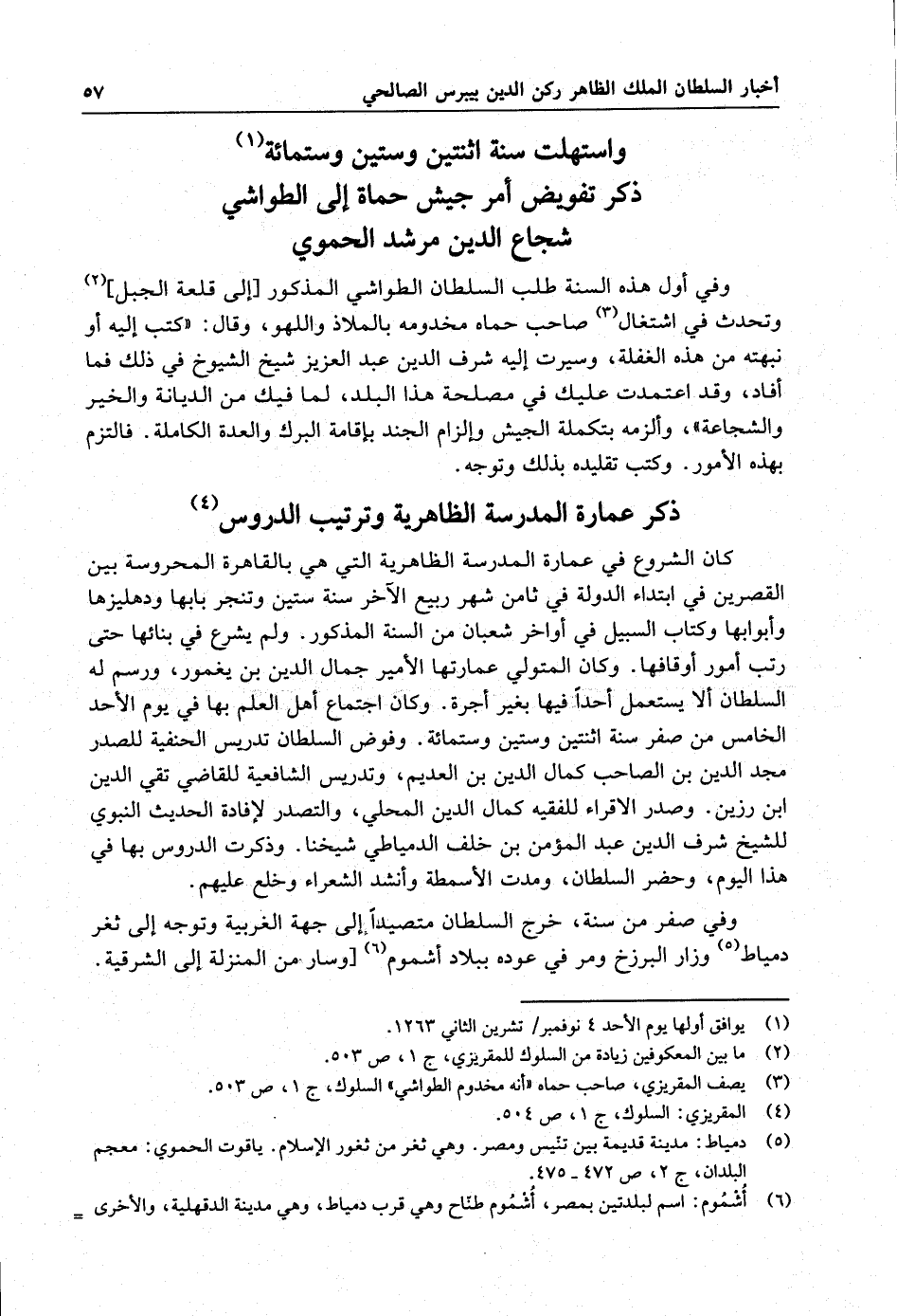كان الشروع في عمارة المدرسة الظاهرية التي هي بالقاهرة المحروسة بين القصرين في ابتداء الدولة في ثامن شهر ربيع الآخر سنة ستين وتنجر بابها ودهليزها وأبوابها وكتاب السبيل في أواخر شعبان من السنة المذكور . ولم يشرع في بنائها حتى رتب أمور أوقافها ، وكان المتولي عمارتها الأمير جمال الدين ابن يغمور ، ورسم له السلطان إلا يستعمل أحدا فيها بغير أجرة . وكان اجتماع أهل العلم بها في يوم الأحد الخامس من صفر سنة اثنتين وستين وستمائة . وفوض السلطان تدريس الحنفية للصدر مجد الدين بن الصاحب كمال الدين بن العديم ، وتدريس الشافعية لقاضي تقي الدين بن رزين . وصدر الافراء للفقيه كمال الدين المحلي ، والتصدر لإفادة الحديث النبوي للشيخ شرف الدين عبد المؤمن بن خلف الدمياطي شيخنا . وذكرت الدروس بها في هذا اليوم ، وحضر السلطان ، ومدت الأسمطة وأنشد الشعراء وخلع عليهم .