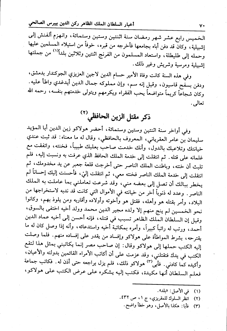 وفي أواخر سنة اثنتين وستين وستمائة ، أحضر هولاكو زين الدين أبا المؤيد سليمان بن عامر العقرياني ، المعروف بالحافظي ، وقال له ما معناه : قد ثبت عندي خيانتك وتلاعبك بالدول ، وأنك خدمت صاحب طبيبا ، فخنته ، واتفقت مع غلمانه على قتله . ثم انتقلت إلى خدمة الملك الحافظ الذي عرفت به ونسبت إليه ، فلم تلبث أن خنته ، وباطنت الملك الناصر حتى أخرجت قلعة جعبر عن يد مخدومك ، ثم انتقلت إلى خدمة الملك الناصر فخنته معي ، ثم انتقلت إلي ، فاحسنت إليك إحسانا لم يخطر ببالك أن تصل إلى بعضه مني ، وقد شرعت تعاملني بما عاملت به الملك الناصر . وعدد له ذنوبا أخر من خيانته في الأموال التي كانت قد ندبه باستخراجها من البلاد ، وأمر بقتله هو وأهله فقتل هو أخوته وأولاده وأقاربه ومن يلوذ بهم ، وكانوا نحو الخمسين لم ينج منهم إلا ولده مجير الدين محمد وولد أخيه اختفى بالسوق وقيل أن السلطان الملك الظاهر تسبب في قتله ، فأنه أحسن إلى أخيه عماد الدين أحمد ، ورتب له راتبا كبيرا ، وأمره بمكاتبة أخيه واستدعائه ، وأنه إذا وصل كان له ما يقترحه ، بشرط المواطأة على هولاكو وإفساد من يقدر على إفساده منهم . فلما وصلت إليه الكتب حملها إلى هولاكو وقال : إن صاحب مصر إنما يكاتبني بمثل هذا لتقع الكتب في يدك فتقتلني ، وقد عزمت على أن أكاتب الأمراء القائمين بدولته والأعيان ، وأكيده كما كادني . فأبى هولاكو ذلك ، فلم يزل يراجعه حتى أذن له . فكاتب جماعة فعلم السلطان أنها مكيدة ، فكتب إليه يشكره على عرض الكتب على هولاكو ،