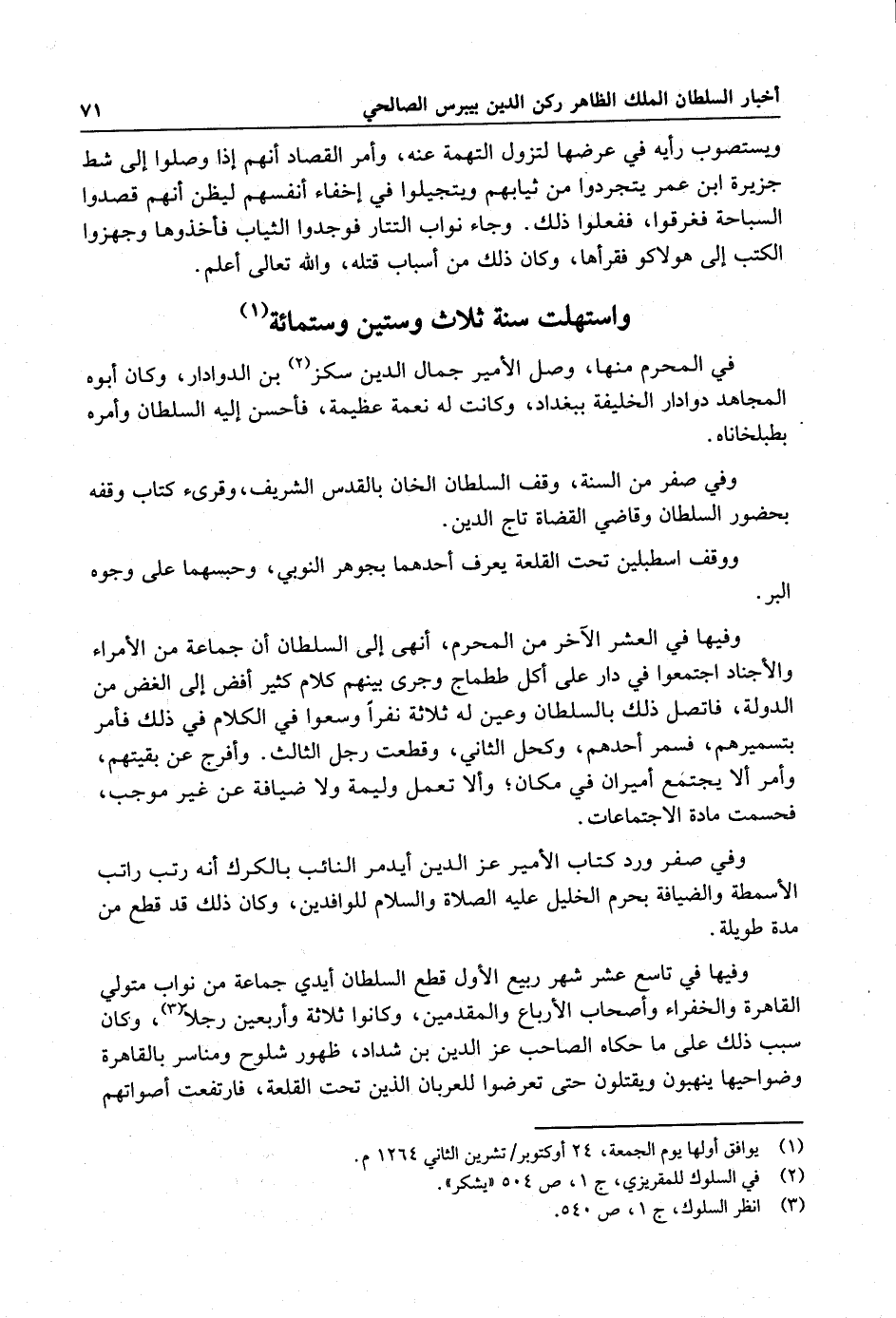 وفيها في تاسع عشر شهر ربيع الأول قطع السلطان أيدي جماعة من نواب متولي القاهرة والخفراء وأصحاب الأرباع والمقدمين ، وكانوا ثلاثة وأربعين رجلا ، وكان سبب ذلك على ما حكاه الصاحب عز الدين بن شداد ، ظهور شلوح ومناسر بالقاهرة وضواحيها ينهبون ويقتلون حتى تعرضوا للعريان الذين تحت القلعة ، فارتفعت أصواتهم