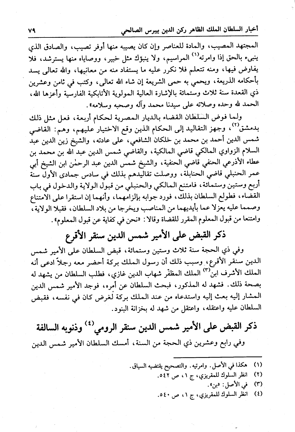 وفي ذي الحجة سنة ثلاث وستين وستمائة ، قبض السلطان على الأمير شمس الدين سنقر الأقرع . وسبب ذلك ان رسول الملك بركة أحضر معه رجلا ادعى أنه الملك الأشرف بن الملك المظفر شهاب الدين غازي ، فطلب السلطان من يشهد له بصحة ذلك ، فشهد له المذكور ، فبحث السلطان عن أمره ، فوجد الأمير شمس الدين المشار إليه بعث إليه واستدعاه من عند الملك بركة لغرض كان في نفسه ، فقبض السلطان عليه واعتقله ، واعتقل من شهد له بخزانة البنود .