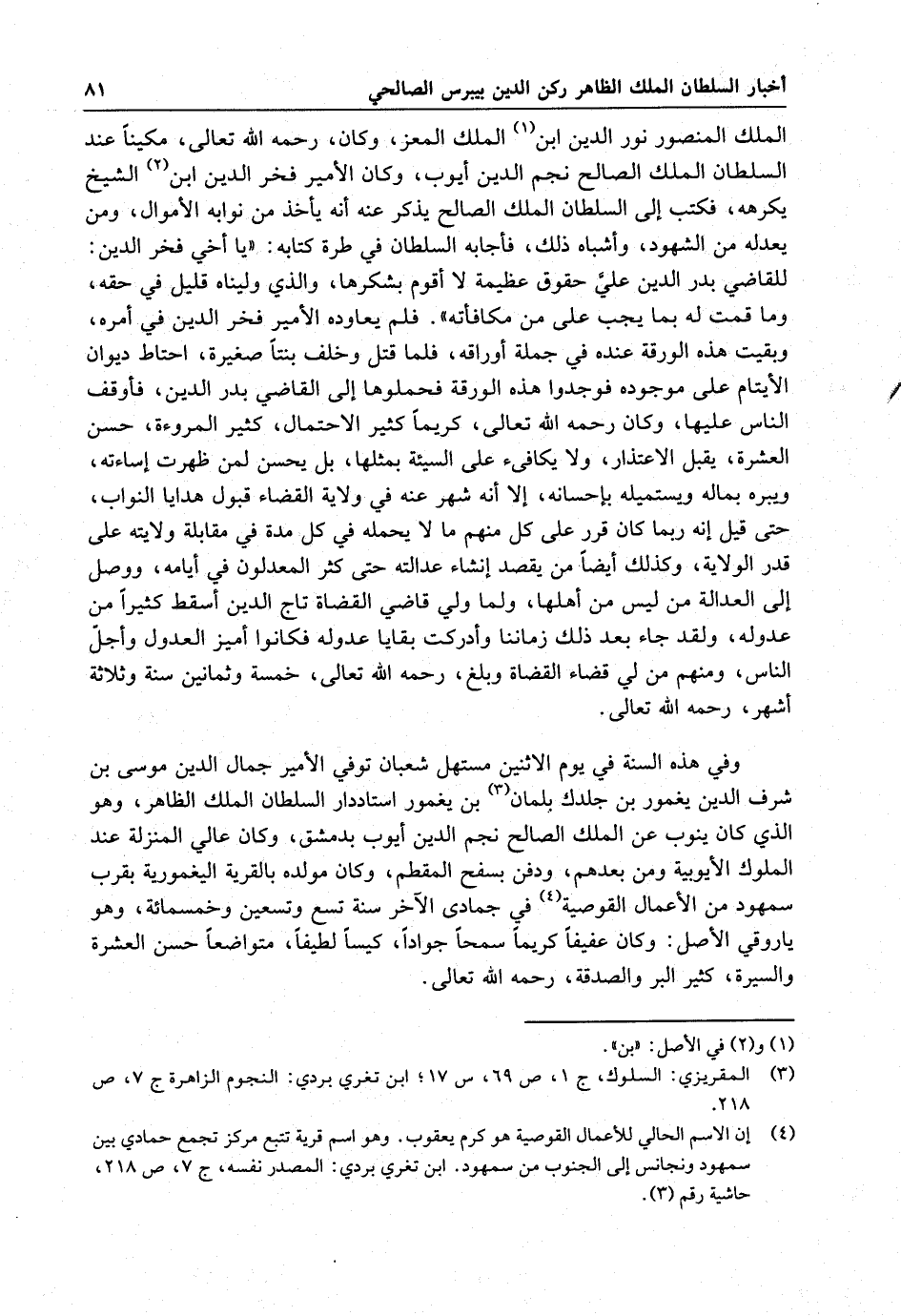 الملك المنصور نور الدين بن الملك المعز ، وكان ، رحمه الله تعالى ، مكينا عند السلطان الملك الصالح نجم الدين أيوب ، وكان الأمير فخر الدين بن الشيخ يكرهه ، فكتب إلى السلطان الملك الصالح يذكر عنه انه يأخذ من نوابه الأموال ، ومن يعدله من الشهود ، وأشباه ذلك ، فأجابه السلطان في طرة كتابه : " يا أخي فخر الدين : للقاضي بدر الدين على حقوق عظيمة لا أقوم بشكرها ، والذي وليناه قليل في حقه ، وما قمت له بما يجب على من مكافئته " ، فلم يعاوده الأمير فخر الدين في أمره ، وبقيت هذه الورقة عنده في جملة أوراقه ، فلما قتل وخلف بنت صغيرة ، احتاط ديوان الأيتام على موجوده فوجدوا هذه الورقة فحملوها إلى ىالقاضي بدر الدين ، فأوقف الناس عليها ، وكان رحمه الله تعالى ، كريما كثير الاحتمال كثير المروءة ، حسن العشرة ، يقبل الاعتذار ، ولا يكافئ على السيئة بمثلها ، بل يحسن لمن ظهرت اساءته ، ويبره بماله ويستميله بإحسانه ، إلا أنه شهر عنه في ولاية القضاء قبول هدايا النواب ، حتى قيل إنه ربما كان قرر على كل منهم ما لا يحمله في كل مدة في مقابلة ولايته على قدر الولاية ، وكذلك أيضا من يقصد إنشاء عدالته حتى كثر المعدلون في أيامه ، ووصل إلى العدالة من ليس من أهلها ، ولما ولي قاضي تالقضتة تاج الدين أسقط كثيرا من عدوله ، ولقد جاء بعد ذلك زماننا وأدركت بقايا عدوله فكانوا أميز العدول وأجل الناس ، ومنهم من ولي قضاء القضاة وبلغ ، رحمه الله تعالى ، خمسة وثمانين سنة وثلاثة أشهر ، رحمه الله تعالى . وفي هذه السنة في يوم الاثنين مستهل شعبان توفي الأمير جمال الدين موسى بن شرف الدين يغمور بن جلدك بلمان بن يغمور استاد دار السلطان الملك الظاهر ، وهو الذي كان ينوب عن الملك الصالح نجم الدين أيوب بدمشق ، وكان عالي المنزلة عند الملوك الأيوبية ومن بعدهم ، ودفن بسفح المقطم ، وكان مولدهبالقرية اليغمورية بقرب سمهود من الأعمال القوصية في جمادى الآخر سنة تسع وتسعين وخمسمائة ، وهو ياروقي الأصل ، : وكان عفيفا كريما سمحا جوادا ، كيسا لطيفا ، متواضعا حسن العشرة والسيرة ، كثير البر والصدقة ، رحمه الله تعالى .