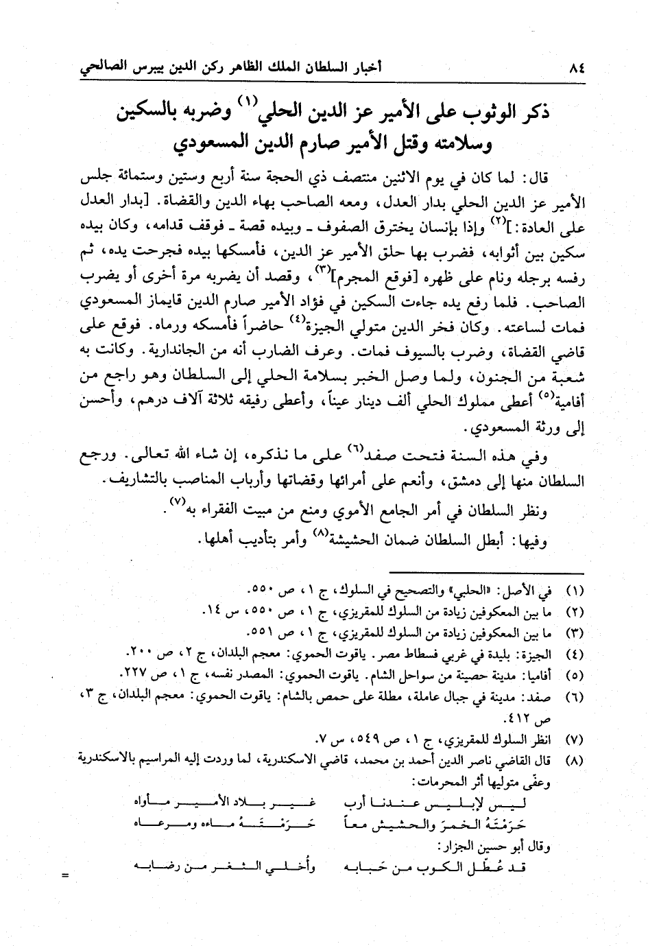 ذكر الوثوب على الأمير عز الدين الحلى وضربه بالسكين وسلامته وقتل الأمير صارم الدين المسعودي