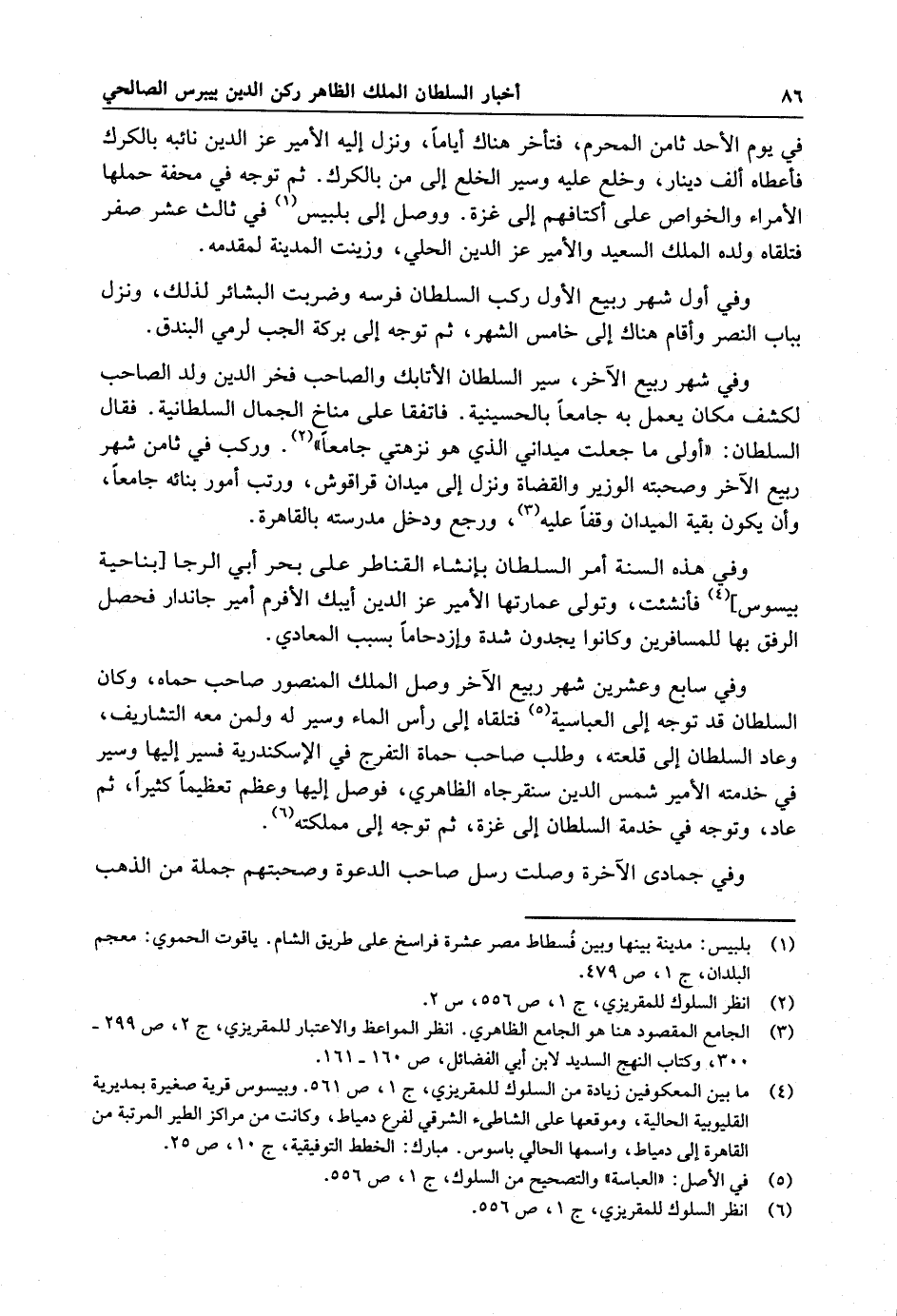 وفي هذه السنة أمر السلطان بإنشاء القناطر على بحر الرجا فأنشئت ، وتولى عمارتها الأمير عز الدين أيبك الأفرم أمير جاندار فحصل الرفق بها للمسافرين وكانوا يجدون شدة وإزدحاما بسبب المعادي . وفي سابع وعشرين شهر ربيع الآخر وصل الملك المنصور صاحب حماة ، وكان السلطان قد توجه إلى العباسة فتلقاه إلى رأس الملء وسير له ولمن معه التشاريف ، وعاد السلطان إلى قلعته . وطلب صاحب حماة التفرج في الإسكندرية فسير إليها وسير في خدمته الأمير شمس الدين سنقر جاه الظاهري ، فوصل إليها وعظم تعظيما كثيرا ، ثم عاد ، وتوجه في خدمة السلطان إلى غزة ثم توجه إلى مملكته .