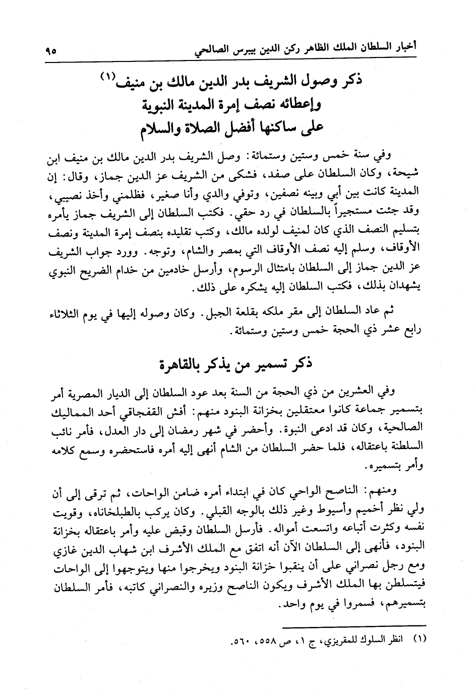 وفي سنة حمس وستين وستمائة : وصل الشريف بدر الدين مالك بن منيف بن شيحة ، وكان على صفد ، فشكى من الشريف عز الدين جماز ، وقال : إن المدينة كانت بين أبي وبينه نصفين ، وتوفي والدي وأنا صغير ، فظلمني وأخذ نصيبي ، وقد جثت مستجيرا بالسلطان في رد حقي . فكتب السلطان إلى الشريف جماز يأمره بتسليم النصف الذي كان لمنيف لولده مالك ، وكتب تقليده بنصف إمرة المدينة ونصف الأوقاف ، وسلم إليه نصف الأوقاف التي بمصر والشام ، وتوجه . وورد جواب الشريف عز الدين جماز إلى السلطان بامتثال الرسوم ، وأرسل خادمين من خدام الضريح النبوي يشهدان بذلك ، فكتب السلطان إليه يشكره على ذلك .