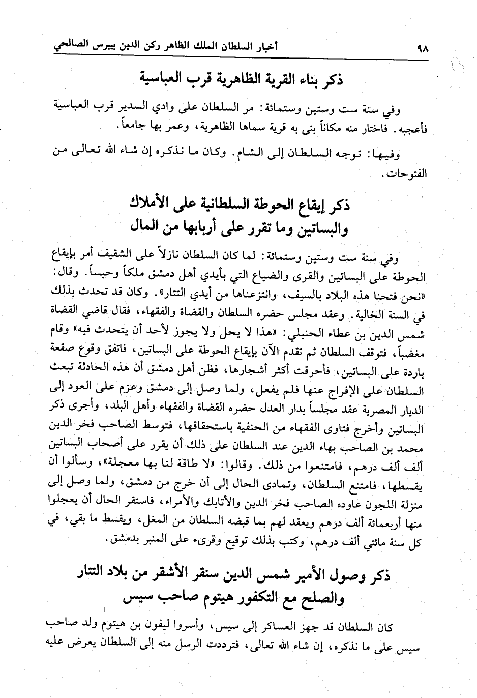 وفي سنة ست وستين وستمائة : لما كان السلطان نازلا على الشقيف أمر بإيقاع الحوطة على البساتين والقرى والضياع التي بأيدي أهل دمشق ملكا وحبسا . وقال : " نحن فتحنا هذه البلاد بالسيف ، وانتزعناها من أيدي التتار " . وكان قد تحدث بذلك في السنة الخالية . وعقد مجلس حضره السلطان والقضاة والفقهاء ، فقال قاضي القضاة شمس الدين بن عطاء الحنبلي : " هذا لا يحل ولا يجوز لأحد أن يتحدث فيه " وقام مغضبا ، فتوقف السلطان ثم تقدم الآن بإيقاع الحيطة على البساتين فاتفق وقوع صقعة باردة على البساتين فأحرقت أكثر أشجارها ، فظن أهل دمشق أن هذه الحادثة تبعث السلطان على الإفراج عنها فلم يقعل ، ولما وصل إلى دمشق وعزم على العود إلى الديار المصرية عقد مجلسا بدار العدل حضره القضاة والفقهاء وأهل البلد ، وأجرى ذلك ذكر البساتين وأخرج فتاوى الفقهاء من الحنفية باستحقاقها ، فتوسط الصاحب فخر الدين بن الصاحب بهاء الدين عند السلطان على أن يقرر على أصحاب البساتين ألف ألف درهم ، فامتنعوا من ذلك . وقالوا : " لا طاقة لنا بها معجلة " ، وسألوا أن يقسطها ، فامتنع السلطان ، وتمادى الحال إلى أن خرج من دمشق ، ولما وصل إلى منزلة اللجون عاوده الصاحب فخر الدين والأتابك والأمراء ، فاستقر الحال أن يعجلوا منها أربعمائة ألف درهم ويعقد لهم نواب السلطان من المغل ، ويقسط ما بقي ، في كل سنة مائتي ألف درهم ، وكتب بذلك توقيع وقرئ على المنبر بدمشق .
