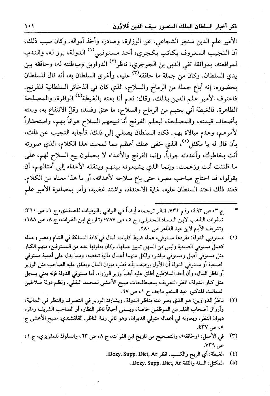 الأمير علم الدين سنجر الشجاعي ، عن الوزارة ، وصادره وأخذ أمواله . وكان سبب ذلك ، أن النجيب المعروف بكاتب بكجري ، أحد مستوفي الدولة ، برز له ، وانتدب لمرافعته ، بموافقة تقي الدين بن الجوجري ، ناظر الدواوين ومباطنته له ، وحاققه بين يدي السلطان . وكان من جملة ما حاققه عليه ، وأغرى السلطان به ، أنه قال للسلطان بحضوره ، إنه أباع جملة من الرماح والسلاح ، الذي كان في الذخائر السلطانية للفرنج . فاعترف الأمير علم الدين بذلك . وقال نعم أنا بعته بالغبطة الوافرة ، والمصلحة الظاهرة . فالغبطة أني أبعتهم من الرماح والسلاح ، ما عتق وفسد ، وقلّ الانتفاع به ، وبعته بأضعاف قيمته . والمصلحة ، ليعلم الفرنج أنا نبيعهم السلاح هواناً بهم ، واستحقاراً لأمرهم ، وعدم مبالاة بهم . فكاد السلطان يصغي إلى ذلك . فأجابه النجيب عن ذلك ، بأن قال له يا مكثل ، الذي خفي عنك أعظم مما لمحت هذا الكلام ، الذي صورته أنت بخاطرك ، وأعددته جواباً . وإنما الفرنج والأعداء لا يحملون بيع السلاح لهم ، على ما ظننت أنت وزعمت . وإنما الذي يشيعونه بينهم وينقله الأعداء إلى أمثالهم ، أن يقولوا ، قد احتاج صاحب مصر ، حتى باع سلاحه لأعدائه ، أو ما هذا معناه من الكلام . فعند ذلك احتد السلطان عليه ، غاية الاحتداد ، واشتد غضبه ، وأمر بمصادرة الأمير علم