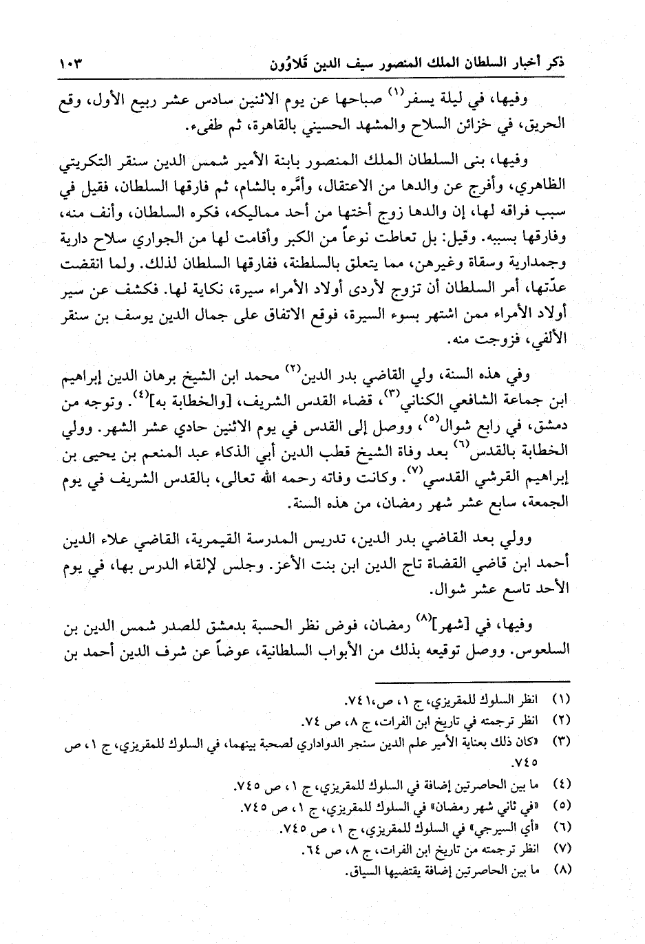 وفيها ، في ليلة يسفر صباحها عن يوم الإثنين سادس عشر ربيع الأول ، وقع الحريق في خزائن السلاح والمشهد الحسيني بالقاهرة ، ثم طفئ . وفيها ، بنى السلطان الملك المنصور بابنة الأمير شمس الدين سنقر التكريتي الظاهري ، وأفرج عن والدها من الاعتقال ، وأمّره بالشام . ثم فارقها السلطان ، فقيل في سبب فراقه لها ، إن والدها زوج أختها من أحد مماليكه ، فكره السلطان ، وأنف منه ، وفارقها بسببه . وقيل ، بل تعاطت نوعاً من الكبر وأقامت لها من الجواري سلاح دارية وجمدارية وسقاة وغيرهن ، مما يتعلق بالسلطنة ، ففارقها السلطان لذلك . ولما انقضت عدّتها ، أمر السلطان أن تزوج لأردى أولاد الأمراء سيرة ، نكاية لها . فكشف عن سير أولاد الأمراء ممن اشتهر بسوء السيرة ، فوق الاتفاق على جمال الدين يوسف بن سنقر الألفي ، فزوجته منه .