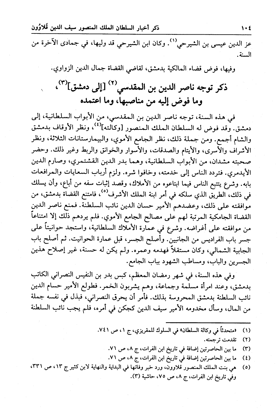 في هذه السنة ، توجه ناصر الدين بن المقدسي ، من الأبواب السلطانية ، إلى دمشق . وقد فوض له السلطان الملك المنصور وكالته ، ونظر الأوقاف بدمشق والشام أجمع . ومن جملة ذلك ، نظر الجامع الأموي ، والبيمارستانات الثلاثة ، ونظر الأشراف والأسرى ، والأيتام والصدقات ، والأسوار والخوانق والربط وغير ذلك . وحضر صحبته مشدان ، من الأبواب السلطانية ، وهما بدر الدين القشتمري ، وصارم الدين الأيدمري . فتردد الناس إلى خدمته ، وخافوا شره . ولزم أرباب السعايات والمرافعات بابه . وشرع يتتبع الناس فيما ابتاعوه من الأملاك ، وقصد إثبات سفه من أباع ، وأن يسلك في ذلك الطريق الذي سلكه في أمر ابنة الملك الأشرف . فامتنع القضاة بدمشق من موافقته على ذلك ، وعضدهم الأمير حسام الدين نائب السلطنة . فمنع ناصر الدين القضاة الجامكية المرتبة لهم على مصالح الجامع الأموي . فلم يردهم ذلك إلا امتناعاً من موافقته على أغراضه . وشرع في عمارة الأملاك السلطانية ، واستجد حوانيتاً على جسر باب الفراديس من الجانبين . وأصلح الجسر ، قبل عمارة الحوانيت . ثم أصلح باب الجابية الشمالي ، وكان مستقلاً فهدمه وعمره . ولم يكن له حسنة ، غير إصلاح هذين الجسرين والباب ، ومساطب الشهود بباب الجامع .