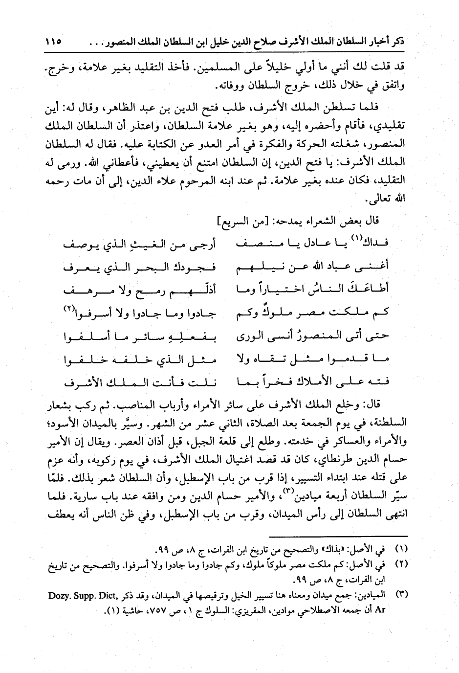 قال ، وخلع الملك الأشرف على سائر الأمراء وأرباب المناصب . ثم ركب بشعار السلطنة ، في يوم الجمعة بعد الصلاة ، الثاني عشر من الشهر . وسيّر بالميدان الأسود ؛ والأمراء والعساكر في خدمته . وطلع إلى قلعة الجبل ، قبل أذان العصر . ويقال إن الأمير حسام الدين طرنطاي ، كان قد قصد اغتيال الملك الأشرف ، في يوم ركوبه ، وأنه عزم على قتله عند ابتداء التسيير ، إذا قرب من باب الإصطبل ، وأن السلطان شعر بذلك . فلما سيّر السلطان أربعة ميادين ، والأمير حسام الدين ومن وافقه عند باب سارية . فلما انتهى السلطان إلى رأس الميدان ، وقرب من باب الإصطبل ، وفي ظن الناس أنه يعطف