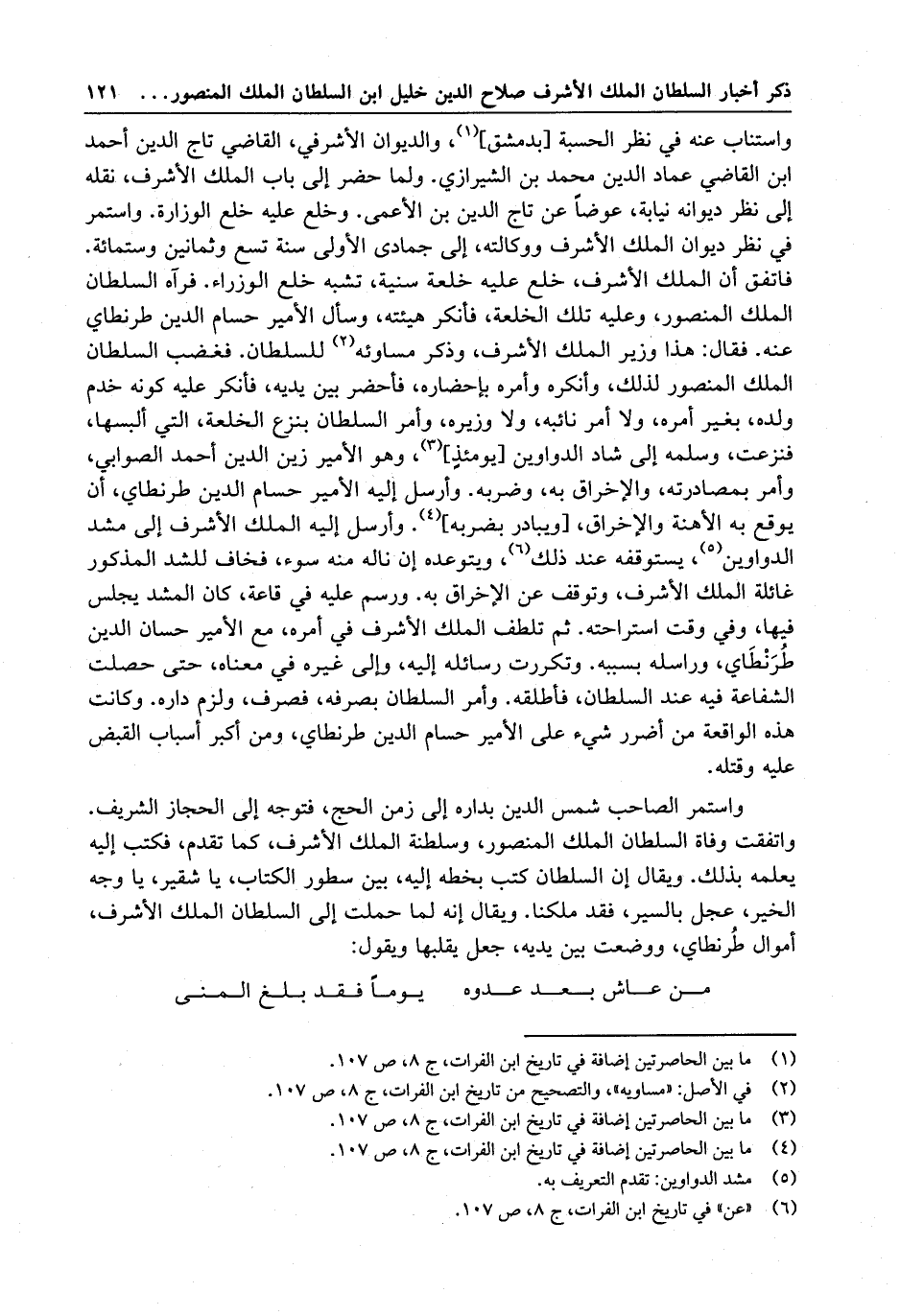 واستمر الصاحب شمس الدين بداره إلى زمن الحج ، فتوجه إلى الحجاز الشريف . واتفقت وفاة السلطان الملك المنصور ، وسلطنة الملك الأشرف ، كما تقدم ، فكتب إليه يعلمه بذلك . ويقال إن السلطان كتب بخطه إليه ، بين سطور الكتاب ، يا شقير ، يا وجه الخير ، عجل بالسير ، فقد ملكنا . ويقال إنه لما حملت إلى السلطان الملك الأشرف ، أموال طرنطاي ، ووضعت بين يديه ، جعل يقلبها ويقول :