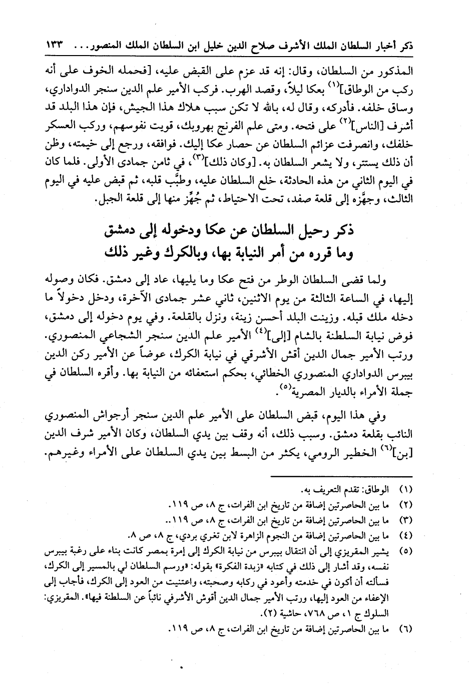 المذكور من السلطان ، وقال إنه قد عزم على القبض عليك ، فحمله الخوف على أنه ركب من الوطاق بعكا ليلاً ، وقصد الهرب . فركب الأمير علم الدين سنجر الدواداري ، وساق خلفه . فأدركه ، وقال له ، بالله لا تكن سبب هلاك هذا الجيش ، فإن هذا البلد قد أشرف الناس على فتحه . ومتى علم الفرنج بهروبك ، قويت نفوسهم ، وركب العسكر خلفك ، وانصرفت عزائم السلطان عن حصار عكا إليك . فوافقه ، ورجع إلى خيمته ، وظن أن ذلك يستتر ، ولا يشعر السلطان به . وكان ذلك في ثامن جمادى الأولى . فلما كان في اليوم الثاني من هذه الحادثة ، خلع السلطان عليه ، وطيّب قلبه ، ثم قبض عليه في الثالث ، وجهّزه إلى قلعة صفد ، تحت الاحتياط ، ثم جُهّز منها إلى قلعة الجبل .