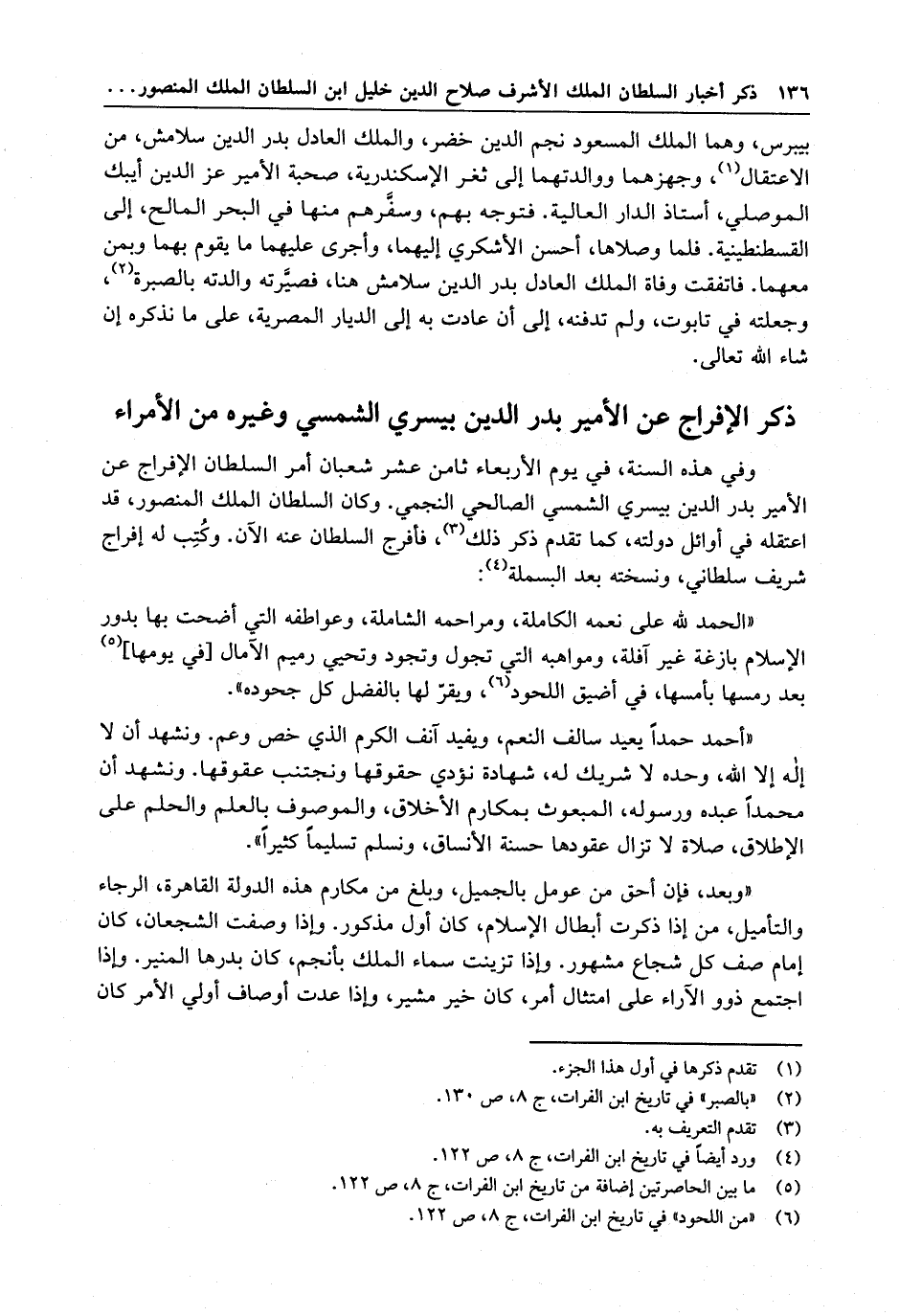 وفي هذه السنة ، في يوم الأربعاء ثامن عشر شعبان ، أمر السلطان بالإفراج عن الأمير بدر الدين بيسري الشمسي الصالحي النجمي . وكان السلطان الملك المنصور ، قد اعتقله في أوائل دولته ، كما تقدم ذكر ذلك ، فأفرج السلطان عنه الآن . وكُتب له إفراج شريف سلطاني ، ونسخته بعد البسملة : الحمد لله على نعمه الكاملة ، ومراحمه الشاملة ، وعواطفه التي أضحت بها بدور الإسلام بازغة غير آفلة ، ومواهبه التي تجول وتجود وتحيي رميم الآمال في يومها بعد رمسها بأمسها ، في أضيق اللحود ، ويقرّ لها بالفضل كل جحوده .