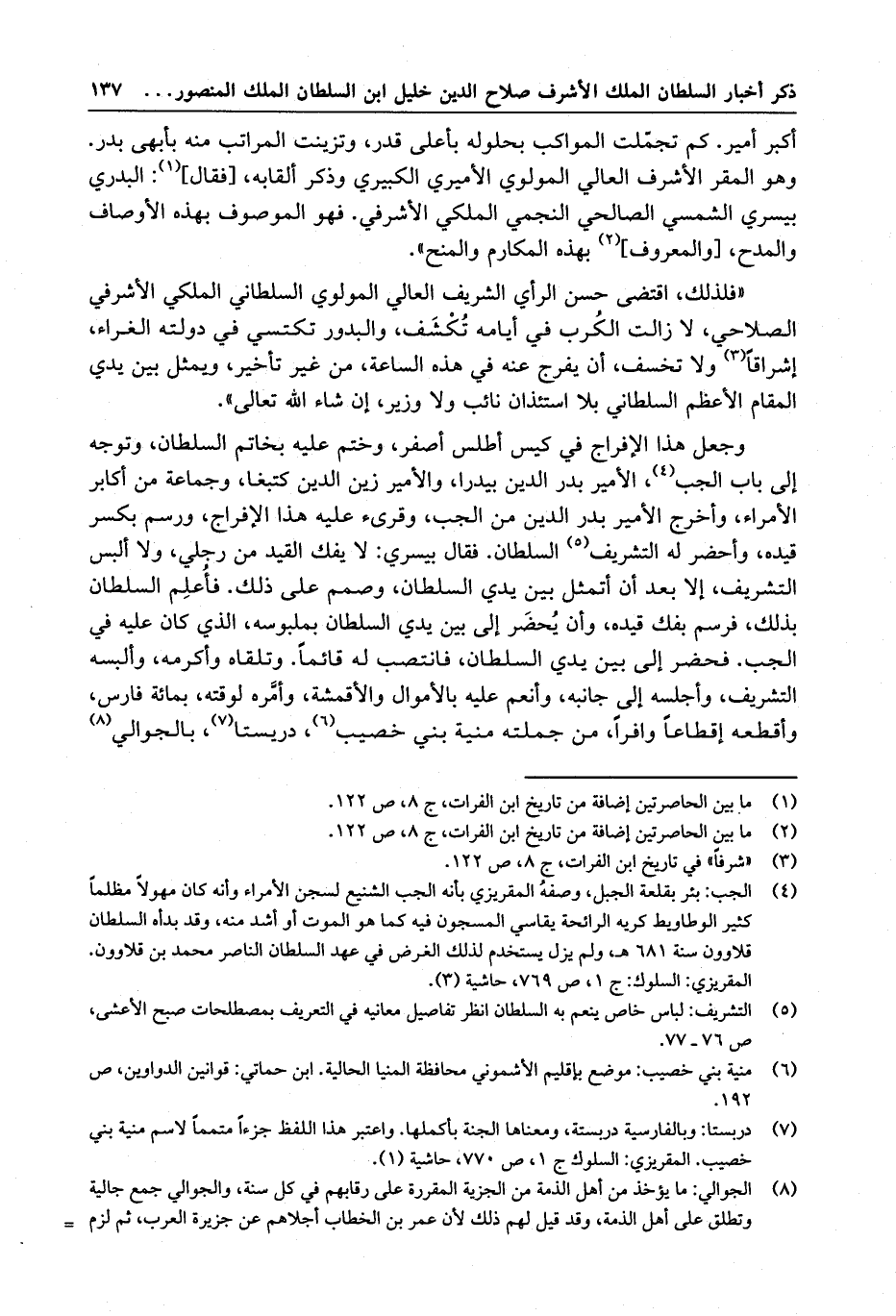 فلذلك ، اقتضى حسن الرأي الشريف العالي المولوي السلطاني الملكي الأشرفي الصلاحي ، لازالت الكُرب في أيامه تُكشَف ، والبدور تكتسي في دولته الغراء ، إشراقاً ولا تخسف ، أن يفرج عنه في هذه الساعة ، من غير تأخير ، ويمثل بين يدي المقام الأعظم السلطاني بلا استئذان نائب ولا وزير ، إن شاء الله تعالى . وجعل هذا الإفراج في كيس أطلس أصفر ، وختم عليه بخاتم السلطان ، وتوجه به إلى باب الجب ، الأمير بدر الدين بيدرا ، والأمير زين الدين كتبغا ، وجماعة من أكابر الأمراء . وأخرج الأمير بدر الدين من الجب ، وقرئ عليه هذا الإفراج ، ورسم بكسر قيده ، وأحضر له التشريف السلطاني . فقال بيسري : لا يفك القيد من رجلي ، ولا ألهس التشريف ، إلا بعد أن أتمثل بين يدي السلطان ، وصمم على ذلك . فأُعلِم السلطان بذلك ، فرسم بفك قيده ، وأن يُحضَر إلى بين يدي السلطان بملبوسه ، الذي كان عليه في الجب . فحضر إلى بين يدي السلطان ، فانتصب له قائماً . وتلقاه وأكره ، وألبسه التشريف ، وأجلسه إلى جانبه ، وأنعم عليه بالأموال والأقمشة ، وأمّره لوقته ، بمائة فارس ، وأقطعه إقطاعاً وافراً ، من جملته منية بني حصيب ، دريستا ، بالجوالي