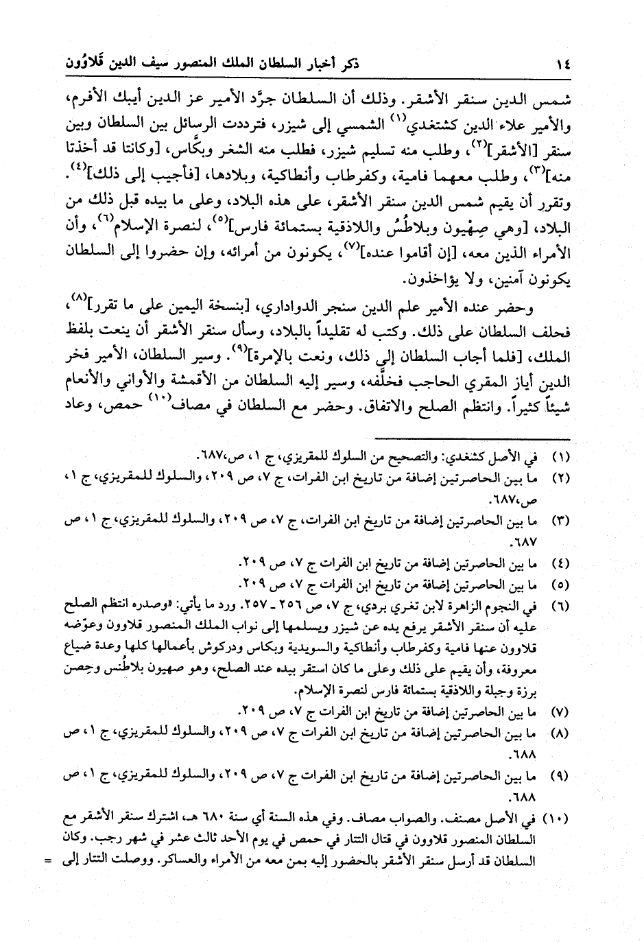وحضر عنده الأمير علم الدين سنجر الداوداري ، بنسخة اليمين على ما تقرر ، فحلف السلطان على ذلك . وكتب له تقليداً بالبلاد ، وسأل سنقر الأشقر ، أن ينعت بلفظ الملك ، فما أجاب السلطان إلى ذلك ، ونعت بالإمرة . وسير السلطان ، الأمير فخر الدين أباز المقري الحاجب فحلّفه ، وسير إليه السلطان من الأقمشة والأواني والأنعام شيئاً كثير . وانتظم الصلح والاتفاق . وحضر مع السلطان في مصاف حمص ، وعاد