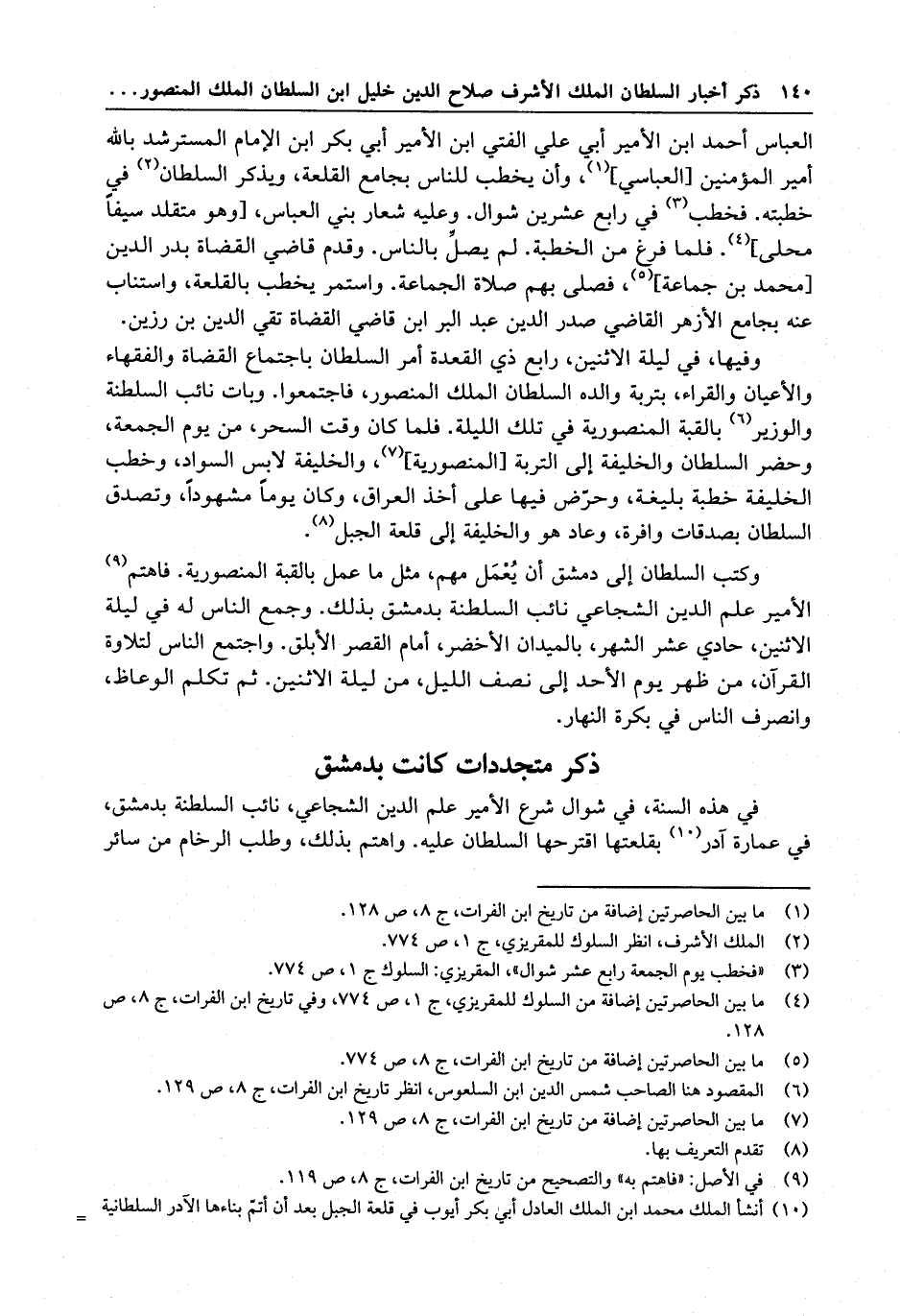 وفيها ، في ليلة الإثنين ، رابع ذي القعدة أمر السلطان باجتماع القضاة والفقهاء والأعيان والقراء ، بتربة والده السلطان الملك المنصور ، فاجتمعوا . وبات نائب السلطنة والوزير بالقبة المنصورية في تلك الليلة . فلما كان وقت السحر ، من يوم الجمعة ، وحضر السلطان والخليفة إلى التربة ، والخليفة لابس السواد ، وخطب الخليفة خطبة بليغة . حرض فيها على أخذ العراق ، وكان يوماً مشهوداً . وتصدق السلطان بصدقات وافرة ، وعاد هو والخليفة إلى قلعة الجبل .