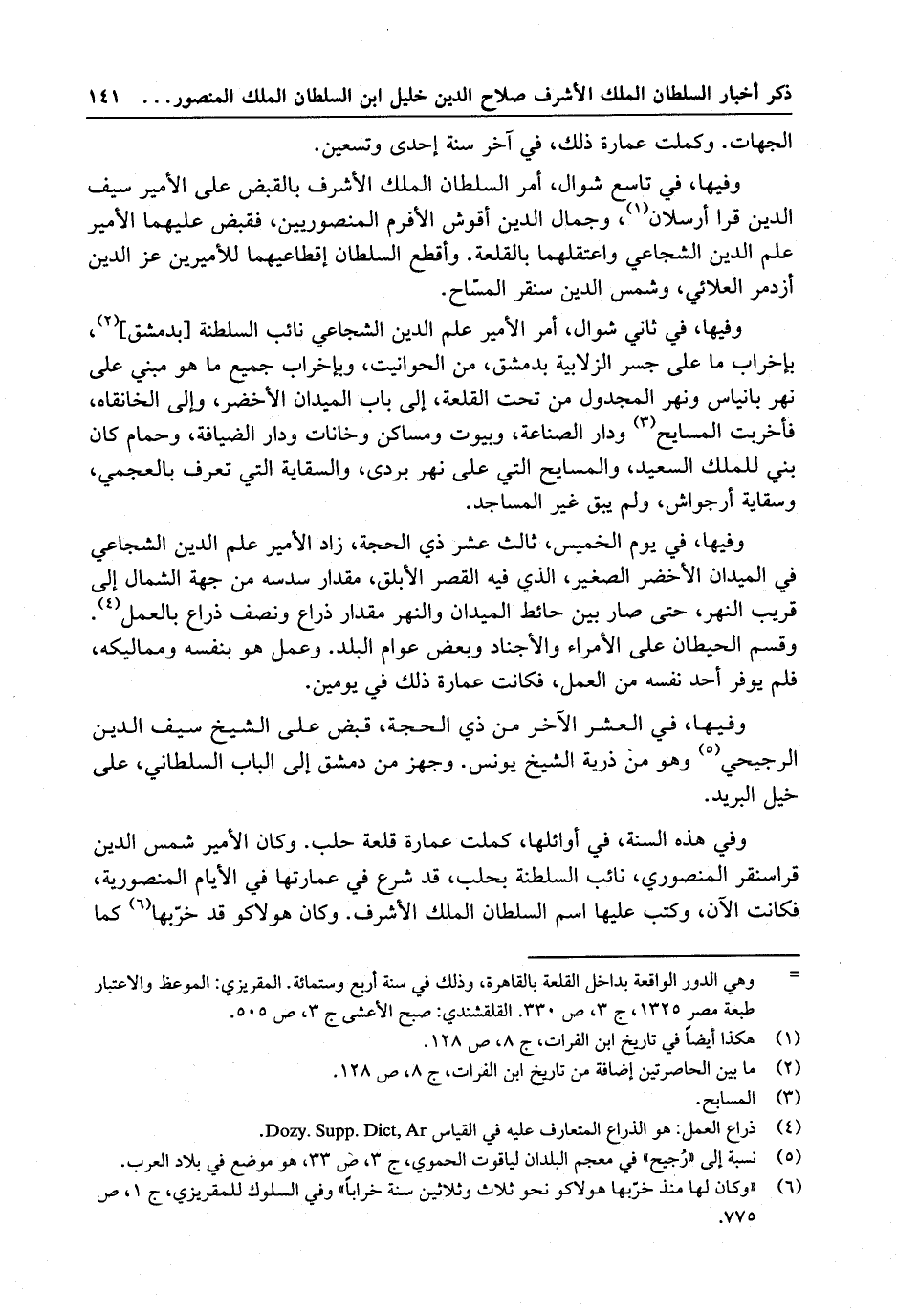 وفي هذه السنة ، في أوائلها ، كملت عمارة قلعة حلب . وكان الأمير شمس الدين قرا سنقر المنصوري ، نائب السلطنة بحلب ، قد شرع في عمارتها في الأيام المنصورية ، فكملت الآن ، وكتب عليها اسم السلطان الملك الأشرف . وكان هولاكو قد خرّبها كما