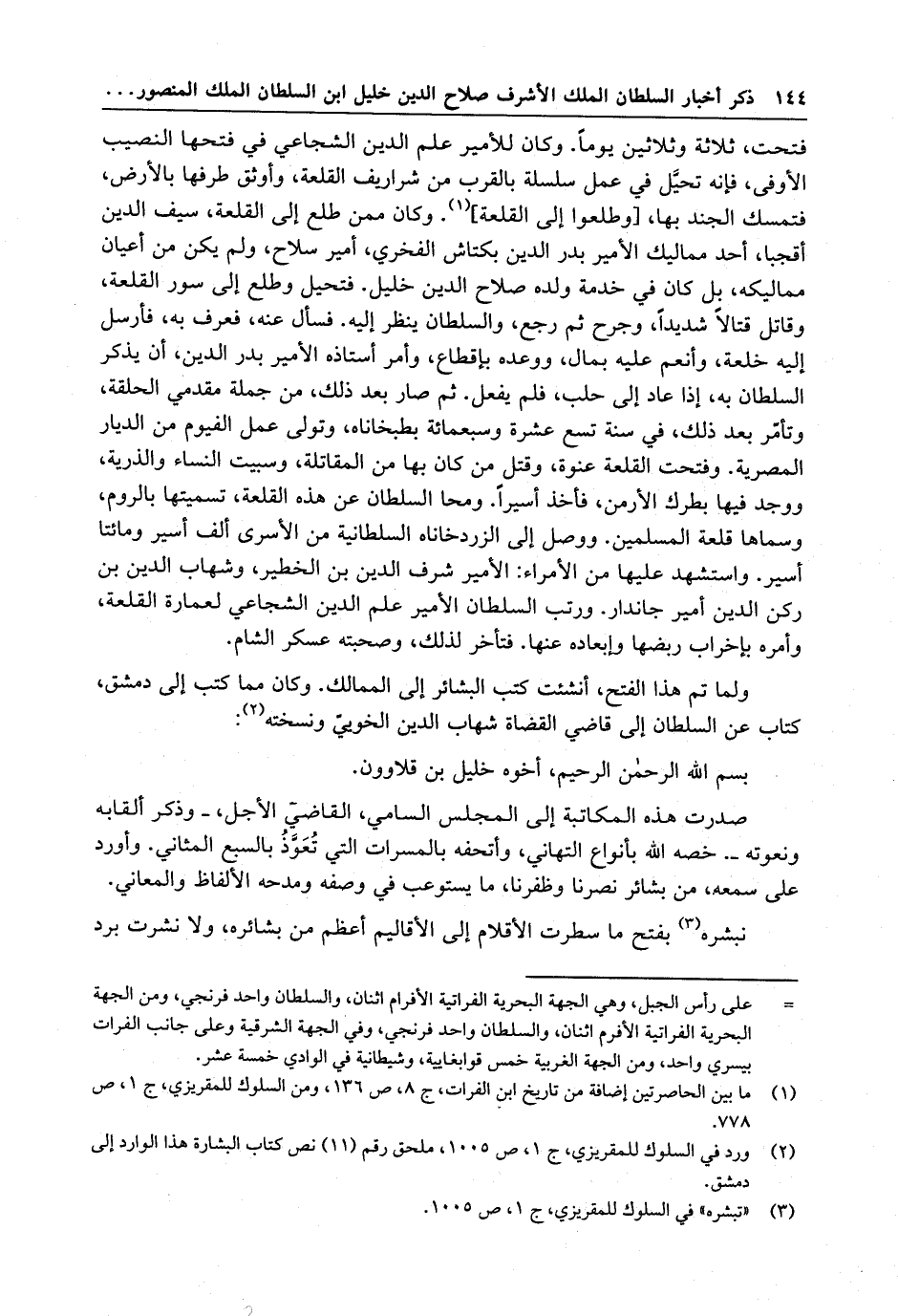 ولما تم هذا الفتح ، أنشئت كتب البشائر إلى الممالك . وكان مما كتب إلى دمشق ، كتاب من السلطان إلى قاضي القضاة شهاب الدين الخويي ونسخته : بسم الله الرحمن الرحيم ، أخوه خليل بن قلاوون .