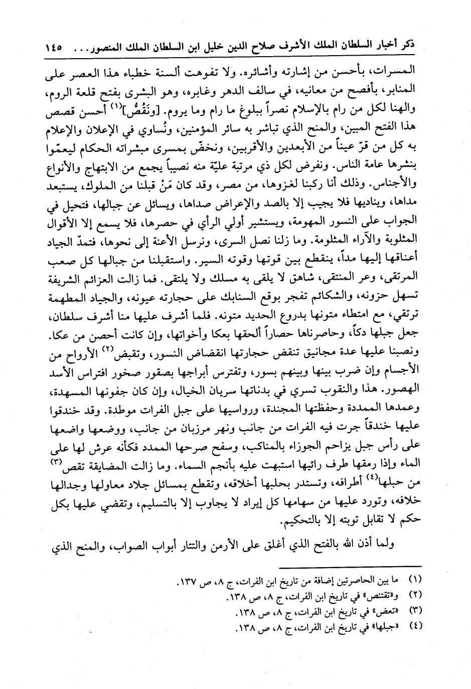 المسرات ، بأحسن من إشارته وأشائره . ولا تفوهت ألسنة خطباء هذا العصر على المنابر ، بأفصح من معانيه ، في سالف الدهر وغابره ، وهو البشرى بفتح قلعة الروم ، والهنا لكل من رام بالإسلام نصراً ببلوغ ما رام وما يروم . ونَقصّ أحسن قصص هذا الفتح المبين ، والمنح الذي تباشر به سائر المؤمنين ، ونُساوي في الإعلان والإعلام به كل من قرّ عيناً من الأبعدين والأقربين . ونخضّ بمسرى مبشراته الحكام ليعموا بنشرها عامة الناس . ونفرض لكل ذي مرتبة عليه منه نصيباً يجمع من الابتهاج والأنواع والأجناس . وذلك أنا ركبنا لغزوها ، من مصر ، وقد كان مَن قبلنا من الملوك ، يستبعد مداها ، ويناديها فلا يجيب إلا بالصد والإعراض صداها ، ويسائل عن جبالها ، فتحيل في الجواب على النسور المهومة ، ويستشير أولي الرأي في حصرها ، فلا يسمع إلا الأقوال المثلوبة والآراء المتلومة . ومازلنا نصل السرى ، ونرسل الأعنة إلى نحوها ، فتمدّ الجياد أعناقها إليها مداً ، ينقطع بين قوتها وقوته السير . واستقبلنا من جبالها كل صعب المرتقى ، وعر المنتقى ، شاهق لا يلقى به مسلك ولا يلتقى . فمازالت العزائم الشريفة تسهل حزونه ، والشكائم تفجر بوقع السنابك على حجارته عيونه ، والجياد المطهمة ترتقي ، مع امتطاء متونها بدروع الحديد متونه . فلما أشرف عليها منا أشرف سلطان ، جعل جبلها دكاً ، وحاصرناها حصاراً ألحقها بعكا وأخواتها ، وإن كانت أحصن من عكا . ونصبنا عليها عدة مجانيق تنقض حجارتها انقضاض النسور ، وتقبض الأرواح من الأجسام وإن ضرب بينها وبينهم بسور ، وتفترس أبراجها بصقور صخور افتراس الأسد الهصور . هذا والنقوب تسري في بدناتها سريان الخيال ، وإن كانت جفونها المسهدة ، وعمدها الممددة وحفظتها المجندة ، ورواسيها على جبل الفرات موطدة . وقد خندقوا عليها خندقاً جرت فيه الفرات من جانب ونهرز مرزبان من جانب ، ووضعها واضعها على رأس جبل يزاحم الجوزاء بالمناكب ، وسفح صرحها الممدد فكأنه عرش لها على الماء وإذا رمقها طرف رائيها اشتبهت عليه بأنجم السماء . ومازالت المضايقة تقص من حبلها أطرافه ، وتستدر بحلبها أخلافه ، وتقطع بمسائل جلاد معاولها وجدالها خلافه . وتورد عليها من سهامها كل إيراد لا يجاوب إلا بالتسليم ، وتقضي عليها بكل حكم لا نقابل توبته إلا بالتحكيم .