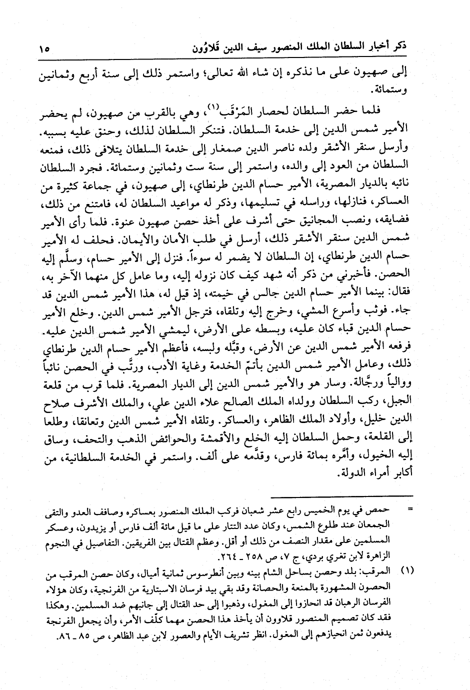 إلى صهيون على ما نذكره إن شاء الله تعالى ؛ واستمر ذلك إلى سنة أربع وثمانين وستمائة . فلما حضر السلطان لحصار المرقب ، وهي بالقبر من صهيون ، لم يحضر الأمير شمس الدين إلى خدمة السلطان . فتنكر السلطان لذلك ، وحنق عليه بسببه . وأرسل سنقر الأشقر ولده ناصر الدين صمغار إلى خدمة السلطان يتلافى ذلك ، فمنعه السلطان من العود إلى والده . واستمر إلى سنة ست وثمانين وستمائة . فجرد السلطان نائبه بالديار المصرية ، الأمير حسام الدين طرنطاي ، إلى صهيون ، في جماعة كثيرة من العساكر ، فنازلها ، وراسله في تسليمها ، وذكر له مواعيد السلطان له . فامتنع من ذلك ، فضايقه ، ونصب المجانيق حتى أشرف على أخذ حصن صهيون عنوة . فلما رأى الأمير شمس الدين سنقر الأشقر ذلك ، أرسل في طلب الأمان والأيمان . فحلف له الأمير حسام الدين طرنطاي ، إن السلطان لا يضمر له سوءاً . فنزل إلى الأمير حسام ، وسلّم إليه الحصن . فأخبرني من ذكر أنه شهد كيف كان نزوله إليه ، وما عامل كل منهما الآخر به ، فقال : بينما الأمير حسام الدين جالس في خيمته ، إذ قيل له ، هذا الأمير شمس الدين قد جاء . فوثب وأسرع المشي ، وخرج إليه وتلقاه ، فترجل الأمير شمس الدين . وخلع الأمير حسام الدين قباء كان عليه ، وبسطه على الأرض ، ليمشي الأمير شمس الدين عليه . فرفعه الأمير شمس الدين عن الأرض ، وقبّله ولبسه . فأعظم الأمير حسام الدين طرنطاي ذلك ، وعامل الأمير شمس الدين بأتمّ الخدمة وغاية الأدب . ورتّب في الحصن تائباً ووالياً ورجّاله . وسار هو والأمير شمس الدين إلى الديار المصرية . فلما قرب من قلعة الجبل ، ركب السلطان وولداه الملك الصالح علاء الدين علي ، والملك الأشرف صلاح الدين خليل ، وأولاد الملك الظاهر ، والعساكر . وتلقاه الأمير شمس الدين وتعانقا ، وطلعا إلى القلعة ، وحمل السلطان إليه الخلع والأقمشة والحوائص الذهب والتحف ، وساق إليه الخيول ، وأمّره بمائة فارس ، وقدّمه على ألف . واستمر في الخدمة السلطانية ، من أكابر أمراء الدولة .