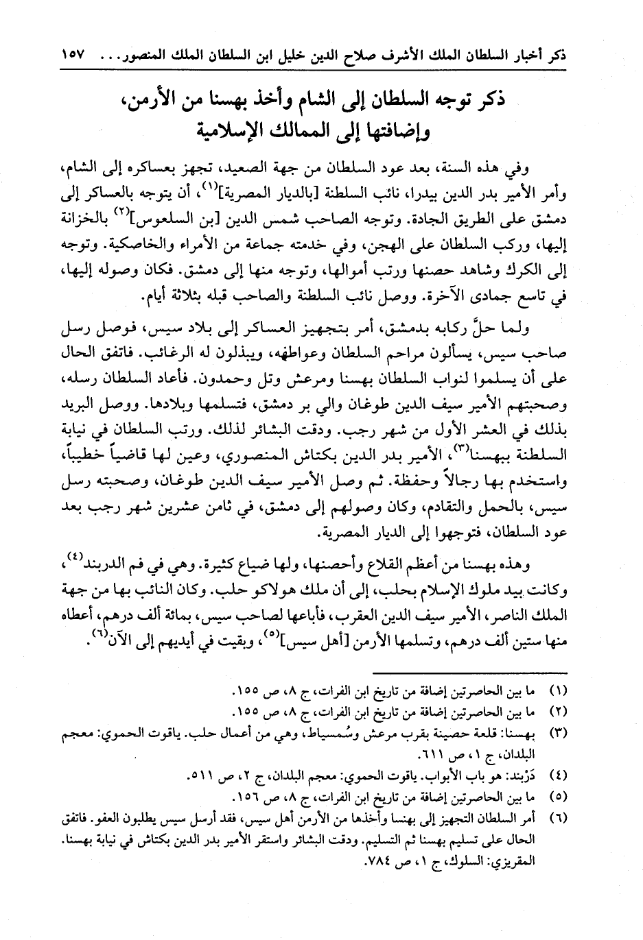 ولما حلّ ركابه بدمشق ، أمر بتجهيز العساكر إلى بلاد سيس ، فوصل رسل صاحب سيس ، يسألون مراحم السلطان وعواطفه ، ويبذلون له الرغائب . فاتفق الحال على أن يسلموا لنواب السلطان بهسنا ومرعش وتل حمدون . فأعاد السلطان رسله ، وصحبتهم الأمير سيف الدين طوغان والي بر دمشق ، فتسلمها وبلادها . ووصل البريد بذلك في العشر الأول من شهر رجب . ودقت البشائر لذلك . ورتب السلطان في نيابة السلطنة ببهسنا ، الأمير بدر الدين بكتاش المنصوري ، وعين لها قاضياً خطيباً . واستخدم بها رجالاً وحفظة . ثم وصل الأمير سيف الدين طوغان ، وصحبته رسل سيس ، بالحمل والتقادم . وكان وصولهم إلى دمشق ، في ثامن عشرين شهر رجب بعد عود السلطان ، فتوجهوا إلى الديار المصرية .