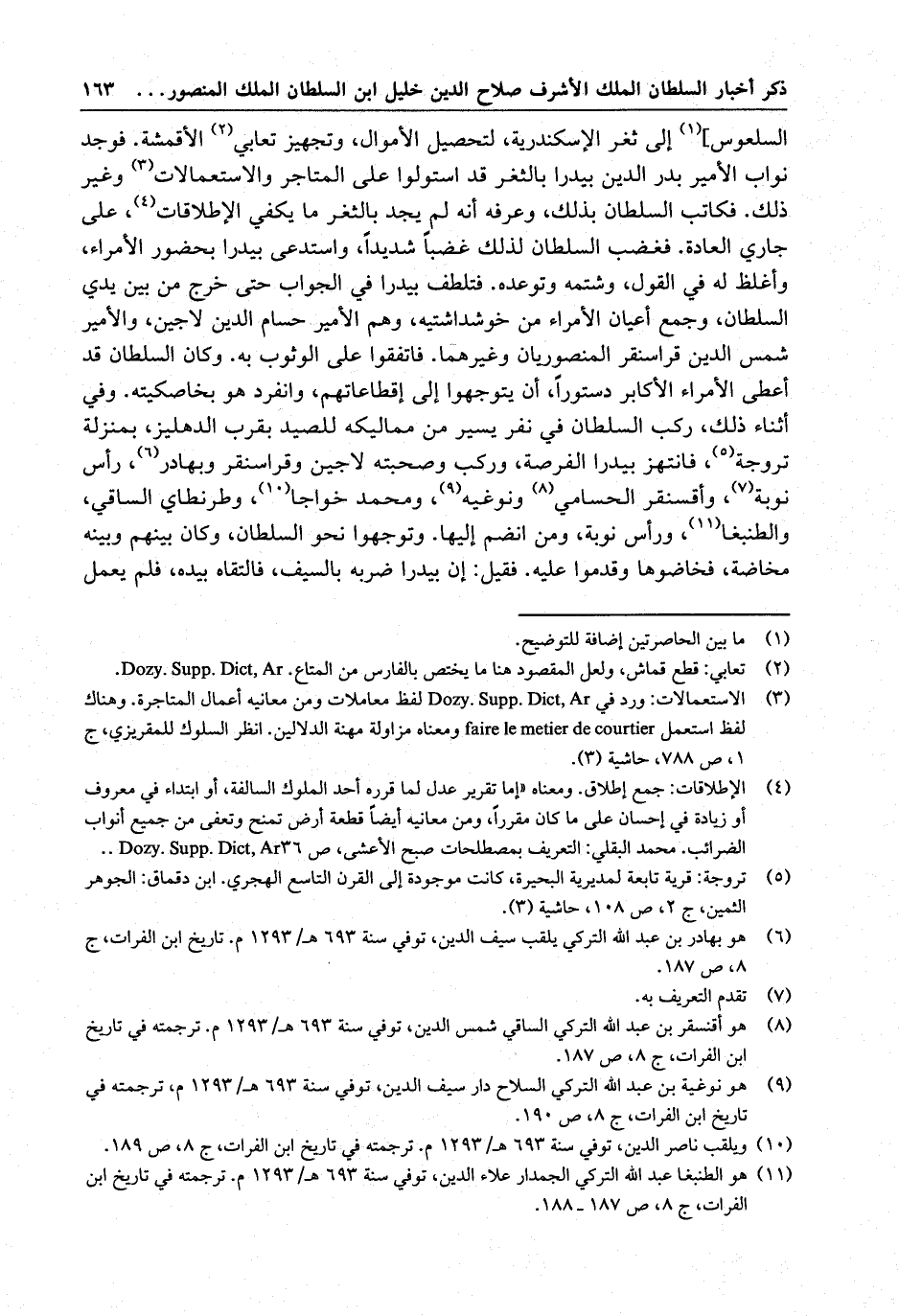 السلعوس إلى ثغر الاسكندرية ، لتحصيل الأموال ، وتجهيز تعابي الأقمشة . فوجد نواب الأمير بدر الدين بيدرا بالثغر قد استولوا على المتاجر والاستعمالات وغير ذلك . فكاتب السلطان بذلك ، وعرفه أنه لم يجد بالثغر ما يكفي الإطلاقات ، على جاري العادة . فغضب السلطان لذلك غضباً شديداً ، واستدعى بيدرا بحضور الأمراء ، وأغلظ له في القول ، وشتمه وتوعده فتلطف بيدرا في الجواب حتى خرج من بين يدي السلطان ، وجمع أعيان الأمراء من خوشداشيته ، وهم الأمير حسام الدين لاجين ، والأمير شمس الدين قراسنقر المنصوريان وغيرهما ، فاتفقوا على الوثوب به . وكان السلطان قد أعطى الأمراء الأكابر دستوراً ، أن يتوجهوا إلى إقطاعاتهم ، وانفرد هو بخاصكيته . وفي أثناء ذلك ، ركب السلطان في نفر يسير من مماليكه للصيد بقرب الدهليز ، بمنزلة تروجة . فانتهز بيدرا الفرصة ، وركب وصحبته لاجين وقراسنقر وبهادر ، رأس نوبة ، وأقسنقر الحسامي ، ونوغيه ، ومحمد خواجا ، وطرنطاي الساقي ، والطنذغا ، رأس نوبة ، ومن انضم إليهم . وتوجهوا نحو السلطان ، وكان بينهم وبينه مخاضة ، فخاضوها وقدموا عليه . فقيل إن بيدرا ضربه بالسيف ، فالتقاه بيده ، فلم يعمل