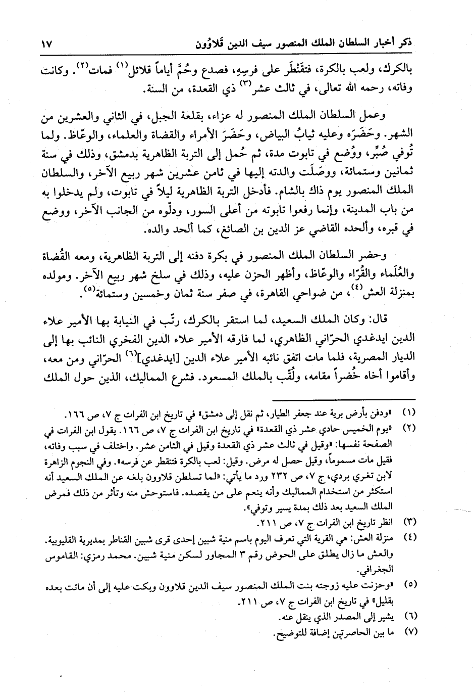 وحضر السلطان الملك المنصور في بكرة دفنه إلى التربة الظاهرية ، ومعه القضاة والعلماء والقراء والوعاظ ، وأظهر الحزن عليه ، وذلك في سلخ شهر ربيع الآخر . ومولده بمنزلة العش ، من ضواحي القاهرة ، في صفر سنة ثمان وخمسين وستمائة . قال : وكان الملك السعيد ، لما استقر بالكرك ، رتب في النيابة بها الأمير علاء الدين ايدغدي الحراني الظاهري ، لما فارقه الأمير علاء الدين الفخري النائب بها إلى الديار المصرية . فلما مات اتفق نائبه الأمير علاء الدين ايدغدي الحراني ومن معه ، وأقاموا أخاه خضراً مقامه ، ولقب بالملك المسعود . فشرع المماليك ، الذين حول الملك