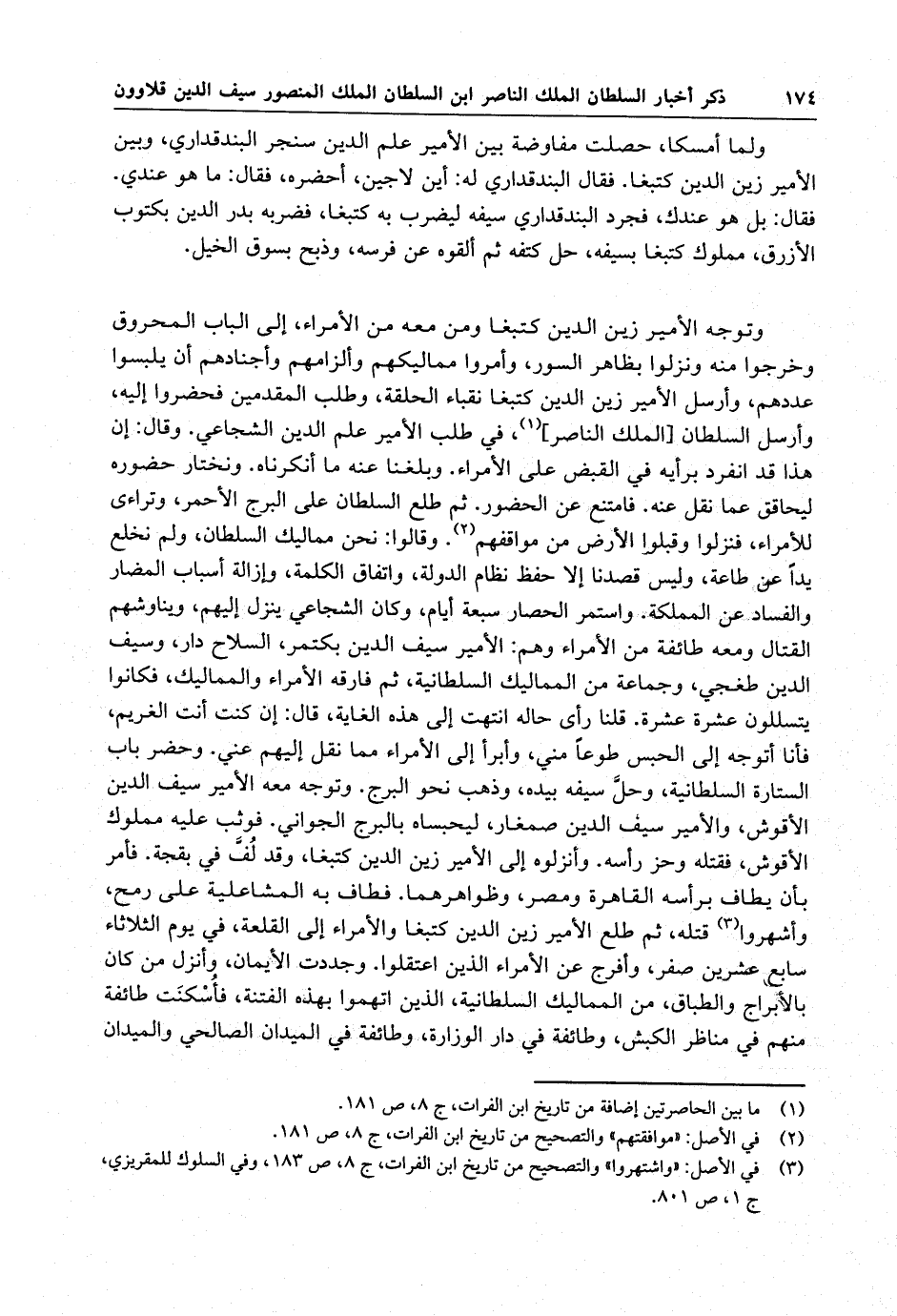 ولما أمسكا ، حصلت مفاوضة بين الأمير علم الدين سنجر البندقداري ، وبين الأمير زين الدين كتبغا . فقال البندقداري له : ابن لاجين ، أحضره . فقال : ما هو عندي . فقال : بل هو عندك . فجرد البندقداري سيفه ليضرب به كتبغا ، فضربه بدر الدين بكتوت الأزرق ، ممولك كتبغا بسيفه ، حل كتفه ثم ألقوه عن فرسه ، وذبح بسوق الخيل .