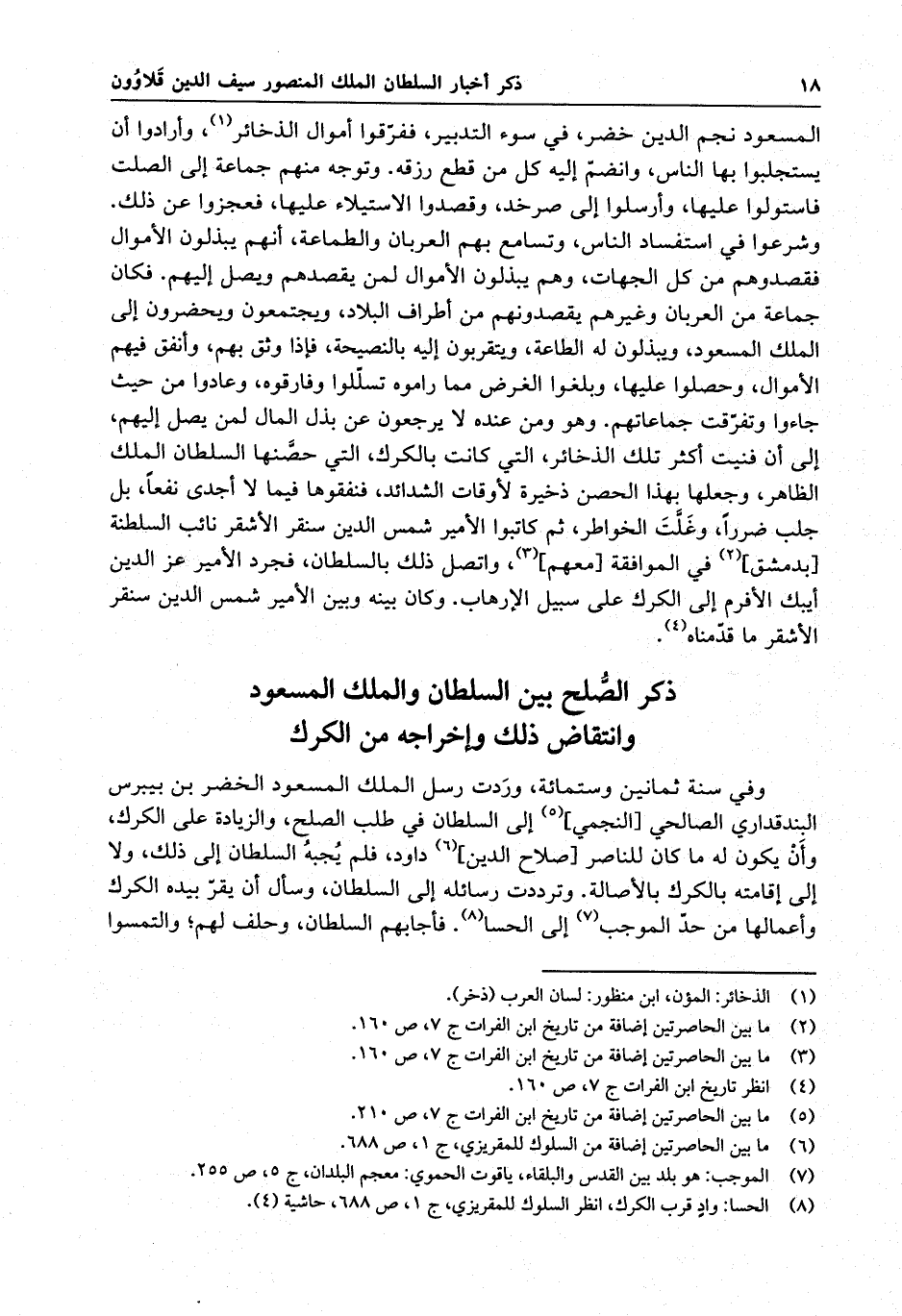 وفي سنة ثمانين وستمائة ، وردت رسل الملك المسعود إلى السلطان في طلب الصلح ، والزيادة على الكرك ، وأن يكون له ما كان للناصر داود ، فلم يجبه السلطان إلى ذلك ، ولا إلى إقامته بالكرك بالأصالة . وترددت رسائله إلى السلطان ، وسأل أن يقر بيده الكرك وأعمالها من حد الموجب إلى الحسا . فأجابهم السلطان ، وحلف لهم ؛ والتمسوا