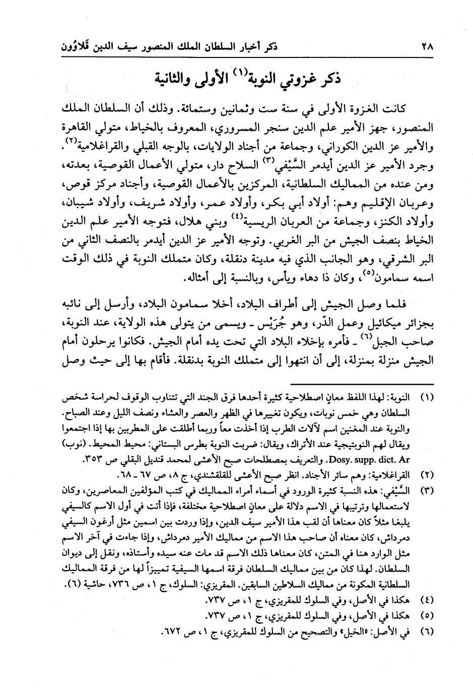 كانت الغزوة الأولى في سنة ست وثمانين وستمائة . وذلك أن السلطان الملك المنصور ، جهز الأمير علم الدين سنجر المسروري ، المعروف بالخياط ، متولي القاهرة والأمير عز الدين الكوراني ، وجماعة من أجناد الولايات ، بالوجه القبلي والقراغلامية . وجرد الأمير عز الدين أيدمر السيفي ، السلاح دار ، متولي الأعمال القوصية ، بعدته ومن عنده من المماليك السلطانية ، المركزين بالأعمال القوصية ، وأجناد مركز قوص ، وعربان الإقليم وهم : أولاد أبي بكر ، وأولاد عمر ، وأولاد شريف ، وأولاد شيبان ، وأولاد الكنز ، وجماعة من العربان الريسية وبني هلال . فتوجه الأمير علم الدين الخياط بنصف الجيش من البر الغربي . وتوجه الأمير عز الدين أيدمر بالنصف الثاني من البر الشرقي ، وهو الجانب الذي فيه مدينة دنقلة . وكان متملك النوبة في ذلك الوقت اسمه سمامون ، وكان ذا دهاء ومكر وبأس ، بالنسبة إلى أمثاله . فلما وصل الجيش إلى أطراف البلاد ، أخلا سمامون البلاد ، وأرسل إلى نائبه بجزائر ميكائيل وعمل الدّو ، وهو جُرَيس - ويسمى من يتولى هذه الولاية ، عند النوبة ، صاحب الجبل - فأمره بإخلاء البلاد التي تحت يده أمام الجيش . فكانوا يرحلون أمام الجيش منزلة بمنزلة ، إلى أن انتهوا إلى متملك النوبة بدنقلة . فأقام بها إلى حيث وصل