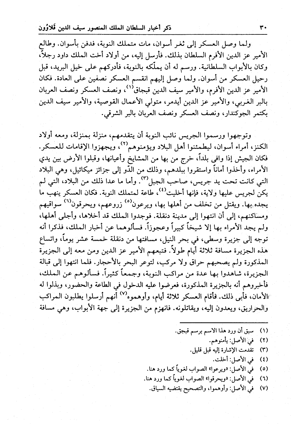 ولما وصل العسكر إلى ثغر أسوان ، مات متملك النوبة ، فدفن بأسوان . وطالع الأمير عز الدين الأفرم السلطان بذلك . فأرسل إليه ، من أولاد أخت الملك داود رجلاً ، كان بالأبواب السلطانية . ورسم له أن يملّكه بالنوبة ، فأدركهم على خيل البريد ، قبل رحيل العسكر من أسوان . ولما وصل إليهم انقسم العسكر نصفين على العادة . فكان الأمير عز الدين الأفرم ، والأمير سيف الدين قبجاق ، ونصف العسكر ونصف العربان بالبر الغربي ، والأمير عز الدين أيدمر ، متولي الأعمال القوصية ، والأمير سيف الدين بكتمر الجوكندار ، ونصف العسكر ونصف العربان بالبر الشرقي . وتوجهوا ورسموا الجريس نائب النوبة أن يتقدمهم ، منزلة بمنزلة ، ومعه أولاد الكنز ، أمراء أسوان ، ليطمئنوا أهل البلاد ويؤمنوهم ، ويجهزوا الإقامات للعسكر . فكان الجيش إذا وافى بلداً ، خرج من بها من المشايخ وأعيانها ، وقبلوا الأرض بين يدي الأمراء ، وأخذوا أماناً واستقروا ببلدهم ، وذلك من الدّو إلى الجزائر ميكائيل ، وهي البلاد التي كانت تحت يد جريس ، صاحب الجبل . وأما ما عدا ذلك من البلاد ، التي لم يكن لجريس عليها ولاية ، فإنها أخليت ، طاعة لمتملك النوبة . فكان العسكر ينهب ما يجد بها ، ويقتل من تخلف من أهلها بها ، ويرعون زروعهم ، ويحرقون سواقيهم ومساكنهم ، إلى أن انتهوا إلى مدينة دنقلة . فوجدوا الملك قد أخلاها ، وأجلى أهلها ، ولم يجد الأمراء بها إلا شيخاً كبيراً وعجوزاً . فسألوهما عن أخبار الملك ، فذكرا أنه توجه إلى جزيرة وسطى ، في بحر النيل ، مسافتها من دنقلة خمسة عشر يوماً . واتساع هذه الجزيرة مسافة ثلاثة أيام طولاً . فتبعهم الأمير عز الدين ومن معه إلى الجزيرة المذكورة ولم يصحبهم حراق ولا مركب ، لتوعر البحر بالأحجار . فلما انتهوا إلى قبالة الجزيرة ، شاهدوا بها عدة من مراكب النوبة ، وجمعاً كثيراً . فسألوهم عن الملك ، فأخبروهم أنه بالجزيرة المذكورة ، فعرضوا عليه الدخول في الطاعة والحضور ، وبذلوا له الأمان ، فأبى ذلك . فأقام العسكر ثلاثة أيام ، وأوهموه أنهم أرسلوا يطلبون المراكب والحراريق ، ويعدون إليه ويقاتلونه . فانهزم من الجزيرة إلى جهة الأبواب ، وهي مسافة