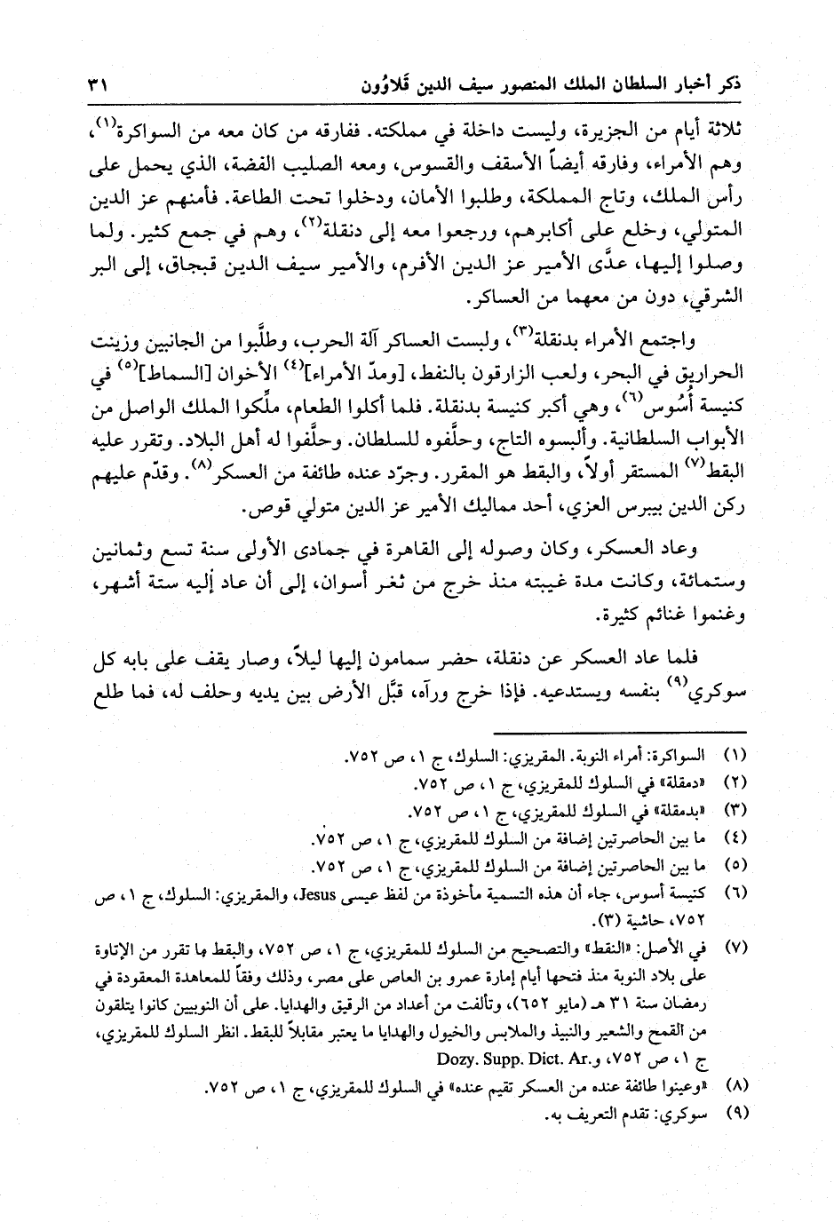 ثلاثة أيام في الجزيرة ، وليست داخلة في مملكته . ففارقه من كان معه من السواكرة ، وهم الأمراء ، وفارقه أيضاً الأسقف والقسوس ، ومعه الصليب الفضة ، الذي يحمل على رأس الملك ، وتاج المملكة ، وطلبوا الأمان ، ودخلوا تحت الطاعة . فأمنهم عز الدين المتولي ، وخلع على أكابرهم ، ورجعوا معه إلى دنقلة ، وهم في جمع كثير ، ولما وصلوا إليها ، عدّى الأمير عز الدين الأفرم ، والأمير سيف الدين قبجاق ، إلى البر الشرقي ، دون من معهما من العساكر .