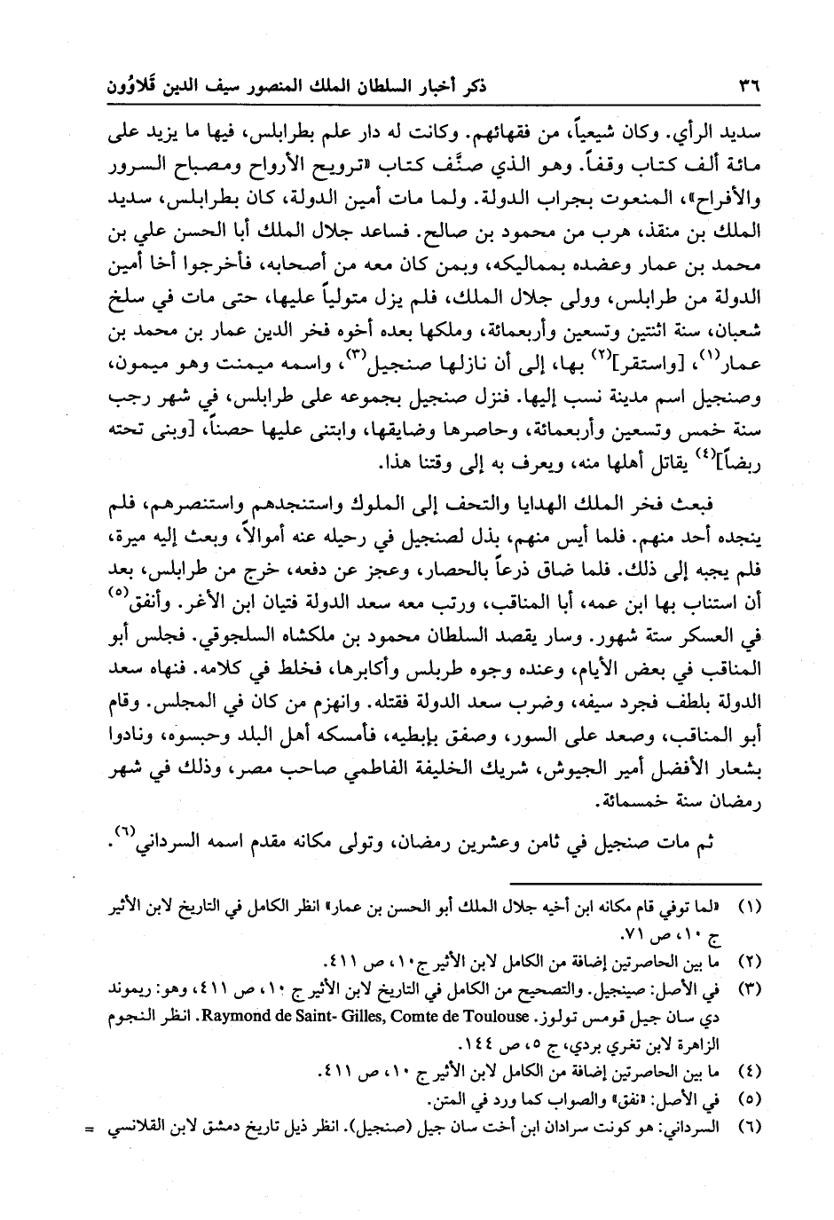 سديد الرأي ، وكان شيعياً ، من فقهائهم . وكانت له دار علم بطرابلس ، فيها ما يزيد على مائة ألف كتاب وقفا . وهو الذي صنّف كتاب ترويج الأرواح ومصباح المرور والأفراح ، المنعوت بجراب الدولة . ولما مات أمين الدولة ، كان بطرابلس ، سديد الملك بن منقذ ، هرب من محمود بن صالح . فساعد جلال الملك أبا الحسن علي بن محمد بن عمار وعضده بمماليكه ، وبمن كان معه من أصحابه . فأخرجوا أخا أمين الدولة من طرابلس ، وولى جلال الملك . فلم يزل متولياً عليها ، حتى مات في سلخ شعبان ، سنة اثنتين وتسعين وأربعمائة ، وملكها بعده أخوه فخر الملك عمار بن محمد بن عمار ، واستقر بها ، إلى أن نازلها صنجيل ، واسمه ميمنت وهو ميمون . وصنجيل اسم مدينة نسب إليها . فنزل صنجيل بجموعه على طرابلس ، في شهر رجب سنة خمس وتسعين وأربعمائة ، وحاصرها وضايقها ، وابتنى عليها حصناً ، يقاتل أهلها منه ، ويعرف به إلى وقتنا هذا .