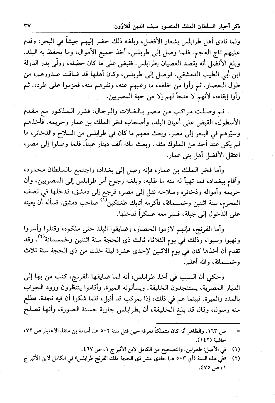 ثم وصلت مراكب من مصر بالغلات والرجال ، فقرر المذكور مع مقدم الأسطول ، القبض على أعيان البلد ، وأصحاب فخر الملك بن عمار وحريمه . فأخذهم وسيّرهم في البحر إلى مصر . وبعث معهم ما كان في طرابلس من السلاح والذخائر ما لم يكن عند أحد من الملوك مثله . وبعث مائة ألف دينار عيناً . فلما وصلوا إلى مصر ، اعتقل الأفضل أهل بني عمار .