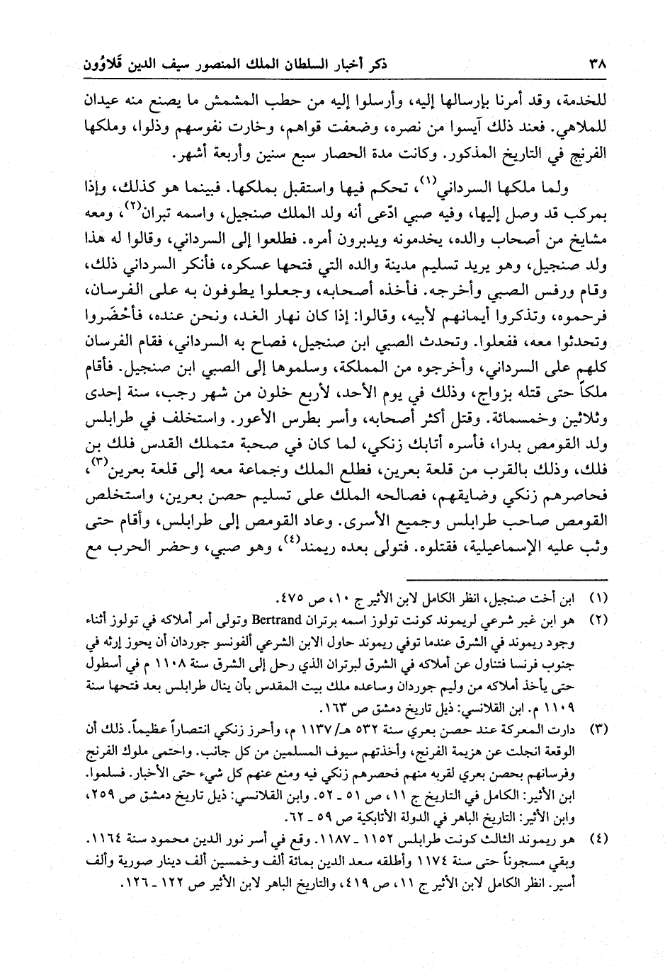 ولما ملكها السرداني ، تحكم فيه واستقل بملكها . فبينما هو كذلك ، وإذا بمركب قد وصل إليها ، وفيه صبي ادعى أنه ولد الملك صنجيل ، واسمه تبران ، ومعه مشايخ من أصحاب والده ، يخدمونه ويدبرون أمره . فطلعوا إلى السرداني ، وقالوا له هذا ولد صنجيل ، وهو يريد تسليم مدينة والده التي فتحها عسكره . فأنكر السرداني ذلك ، وقام ورفس الصبي وأخرجه . فأخذه أصحابه ، وجعلوا يطوفون به على الفرسان ، فرحموه ، وتذكروا أيمانهم لأبيه ، وقالوا : إذا كان نهار الغد ، ونحن عنده ، فاحضروا وتحدثوا معه ، ففعلوا . وتحدث الصبي ابن صنجيل ، فصاح به السرداني ، فقام الفرسان كلهم على السرداني ، وأخرجوه من المملكة ، وسلموها إلى الصبي ابن صنجيل . فأقام ملكاً حتى قتله بزواج ، وذلك في يوم الأحد ، لأربع خلون من شهر رجب ، سنة إحدى وثلاثين وخمسمائة . وقتل أكثر أصحابه ، وأسر بطرس الأعور . واستخلف في طرابلس ولد القومص بدران ، فأسره أتابك زنكي ، لما كان في صحبة متملك القدس فلك بن فلك . وذلك بالقرب من قلعة بعرين ، فطلع الملك وجماعة معه إلى قلعة بعرين ، فحاصرهم زنكي وضايقهم ، فصالحه الملك على تسليم حصن بعرين ، واستخلص القومص صاحب طرابلس وجميع الأسرى . وعاد القومص إلى طرابلس ، وأقام حتى وثب عليه الإسماعيلية ، فقتلوه . فتولى بعده ريمند ، وهو صبي ، وحضر الحرب مع